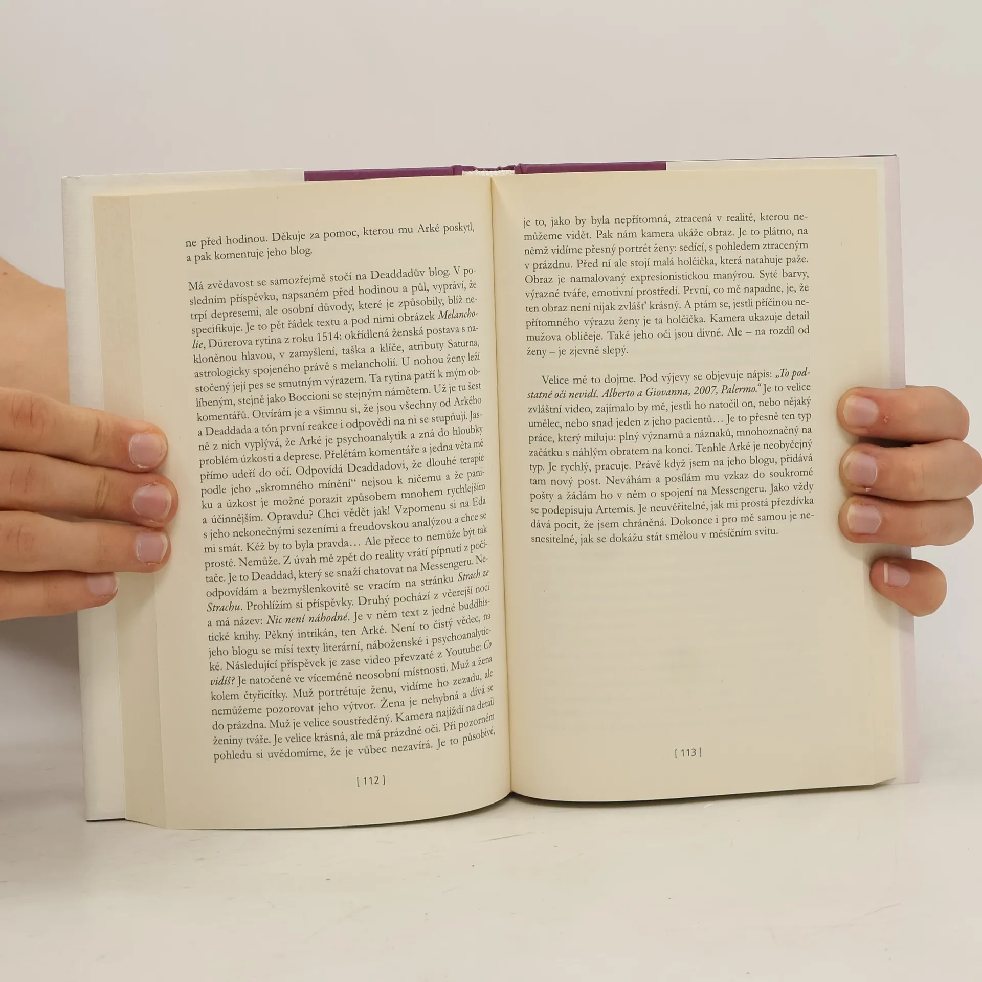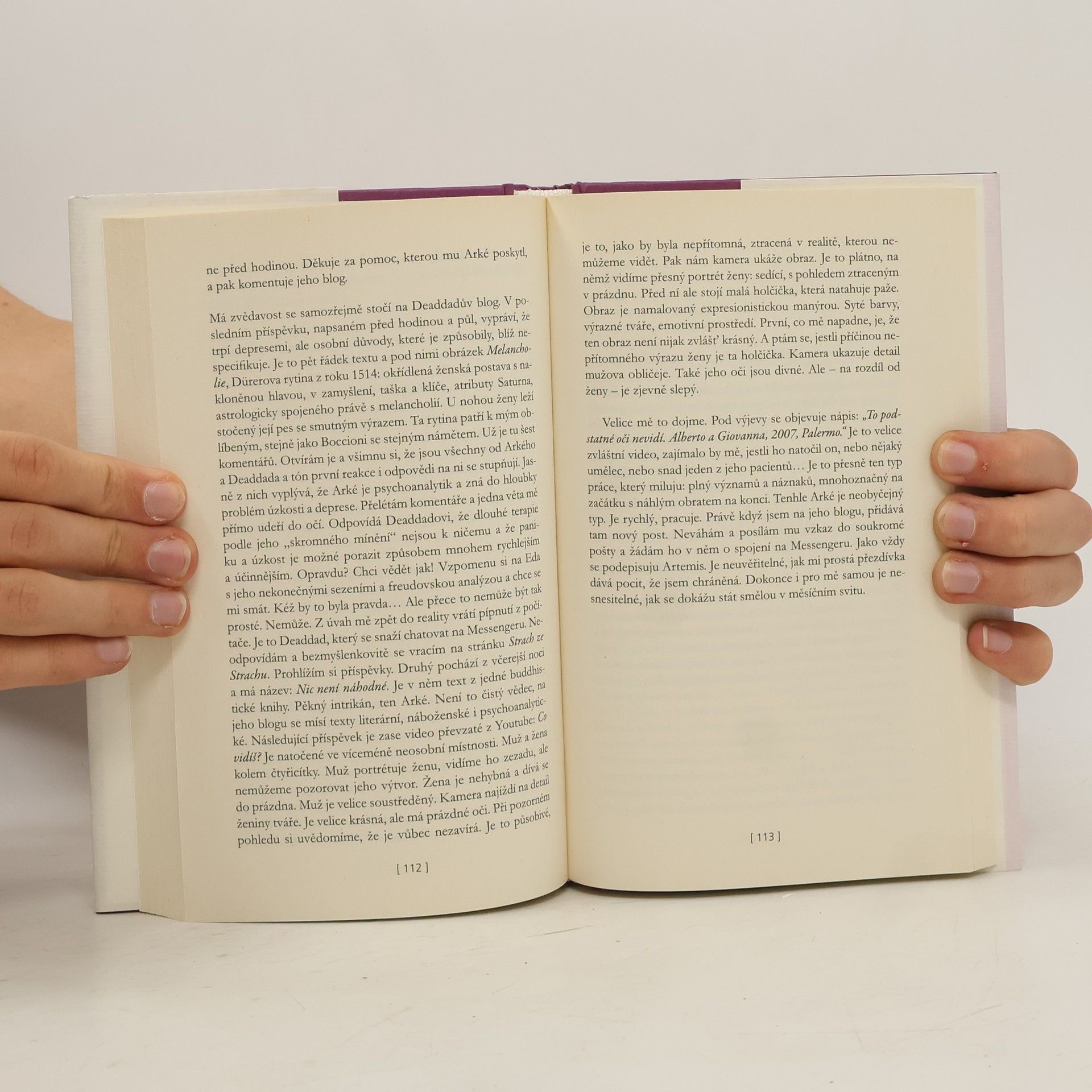 Pětatřicetiletá Bianca žije s Edem, svým bývalým psychoterapeutem, a má povolání, které ji těší. Často se jí však vrací vzpomínka na smrt matky a začnou ji sužovat záchvaty paniky. Odmítá psychofarmaka, pomoc hledá na internetu a přes nejrůznější blogy se dostane k člověku, který jí možná dokáže pomoci. Tajemný Arké ji postupně učí, jak se má postavit minulosti a paniku překonávat... Mimořádně úspěšný román, doplněný odborným doslovem, je poutavý a má velmi aktuální téma, neboť strach, různé obavy a návaly paniky jsou v současnosti velmi rozšířené.