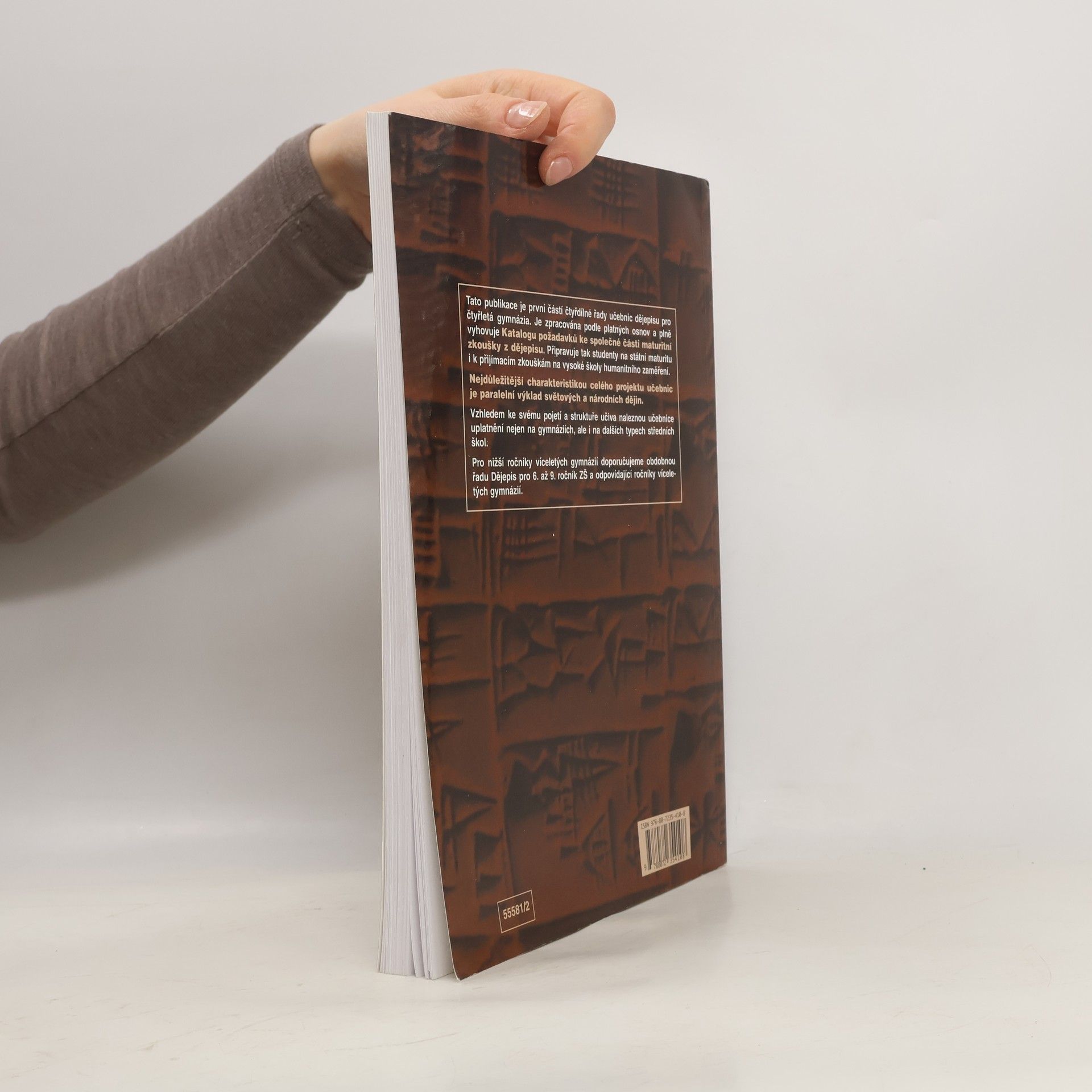 Pravěk a starověk Publikace je prvním dílem čtyřdílné řady učebnic pro čtyřletá gymnázia. Je zpracována podle osnov pro čtyřletá gymnázia. Uplatní se ale i na dalších typech škol, neboť v učebnicích je graficky odlišen základní výklad od rozšiřujícího textu. Vzhledem k rozvržení učiva s důrazem na nové dějiny umožňuje i dobrou přípravu ke studiu na V.Š. humanitního typu. Podstatnou kvalitou řady je její nepřetíženost fakty a především paralelně vedený výklad obecných i národních dějin od nejstarších dob po současnost. Učebnice obsahují bohatý obrazový materiál, početné dějepisné mapy a náležitý didaktický aparát.Pro nižší ročníky víceletých gymnázií doporučujeme obdobnou řadu pro primu až kvartu. Pro každý ročník je určena rovněž jen jedna učebnice. K těmto učebnicím jsou vydány i pracovní sešity. Informace o nich najdete v nabídce pro Z.Š. Všechny tyto učebnice mají schvalovací doložku MŠMT ČR.