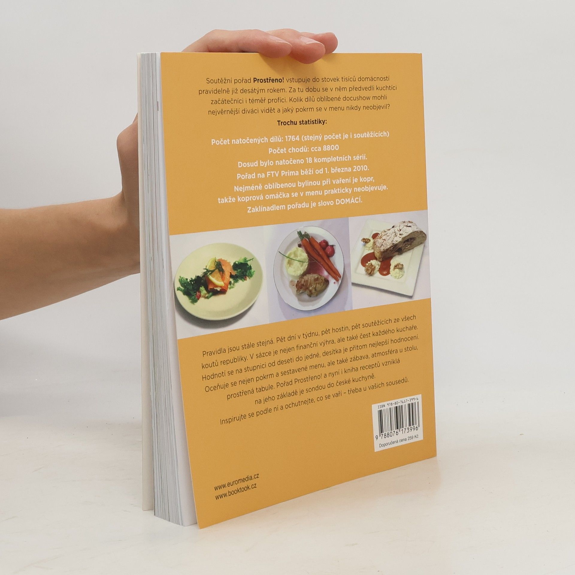 100 rodinných receptů připravených s láskou k jídlu Soutěžní pořad Prostřeno! vstupuje do stovek tisíců domácností pravidelně již desátým rokem. Za tu dobu se v něm předvedli kuchtíci začátečníci i téměř profíci, kteří si byli v počátku soutěžení prakticky jisti svou výhrou. Jenže se zadařilo jen zlomku z nich. Pravidla jsou stále stejná. Pět dní, pět hostin, pět soutěžících ze všech koutů republiky. V sázce je nejen finanční výhra, ale také čest každého kuchaře. Pořad Prostřeno! a nyní i kniha receptů vzniklých na jejich základě je sondou do české kuchyně. Uvařte si podle ní a ochutnejte, co se vaří – třeba u vašich sousedů.