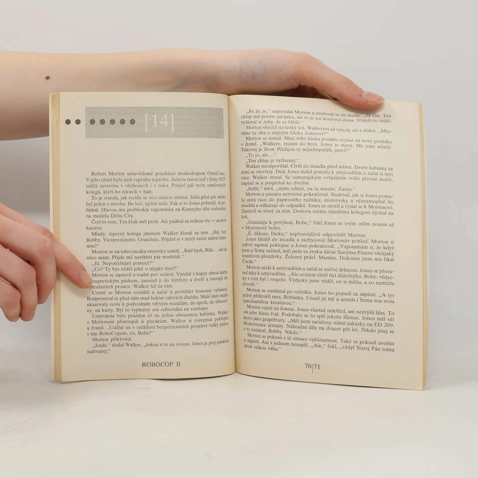 Robocop je hrdina příběhu ze Starého Detroitu v době zhruba za padesát let od naší současnosti – Detroit je i v té době pustým rejdištěm organizovaného zločinu a policisti jsou tu odstřelováni jako lovná zvěř. A právě do tohoto okrsku je přeložen drsný chlapík Murphy, který má ovšem smůlu – je předmětem obludného experimentu všemocné firmy OMNICON, ovládající Detroit, a hned v první akci je rozstřílen na kusy: relativně nedotčená zůstává pouze hlava. A na ni technici namontují robota špičkové úrovně – vzniká téměř neohrozitelný člověk – stroj, robot s lidskými city a smyslem pro fair play. Robocopův zápas s podlým představitelem OMNICONU je plný napětí, slz, krve, plamenů a detonací, jaké jsme zvyklí vidět v akčních filmech. Robocop je krimi, sci-fi, thriller i pohádka dohromady, četba, která přináší napětí i uvolnění i zadostiučinění nad poraženým zlem.... celý text
