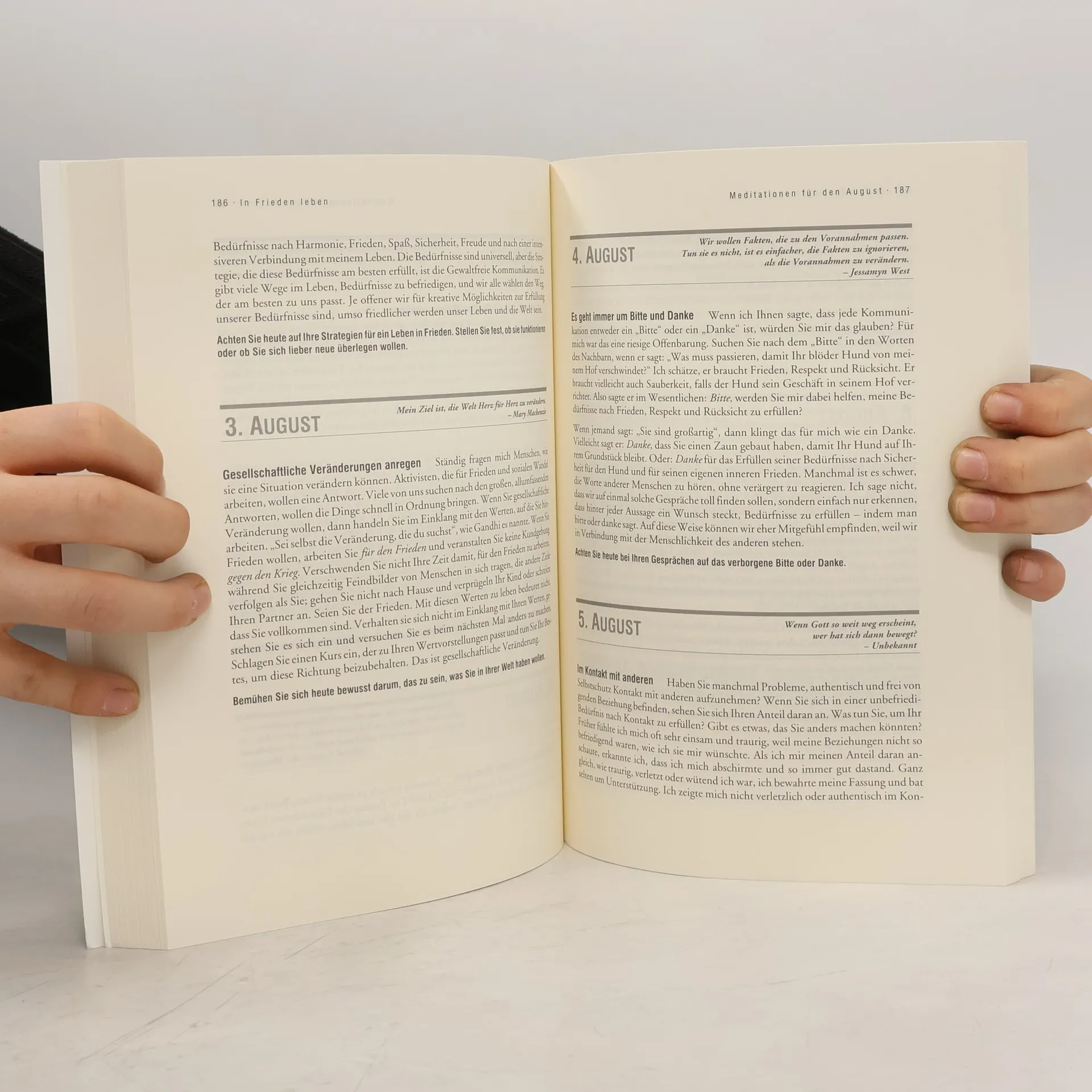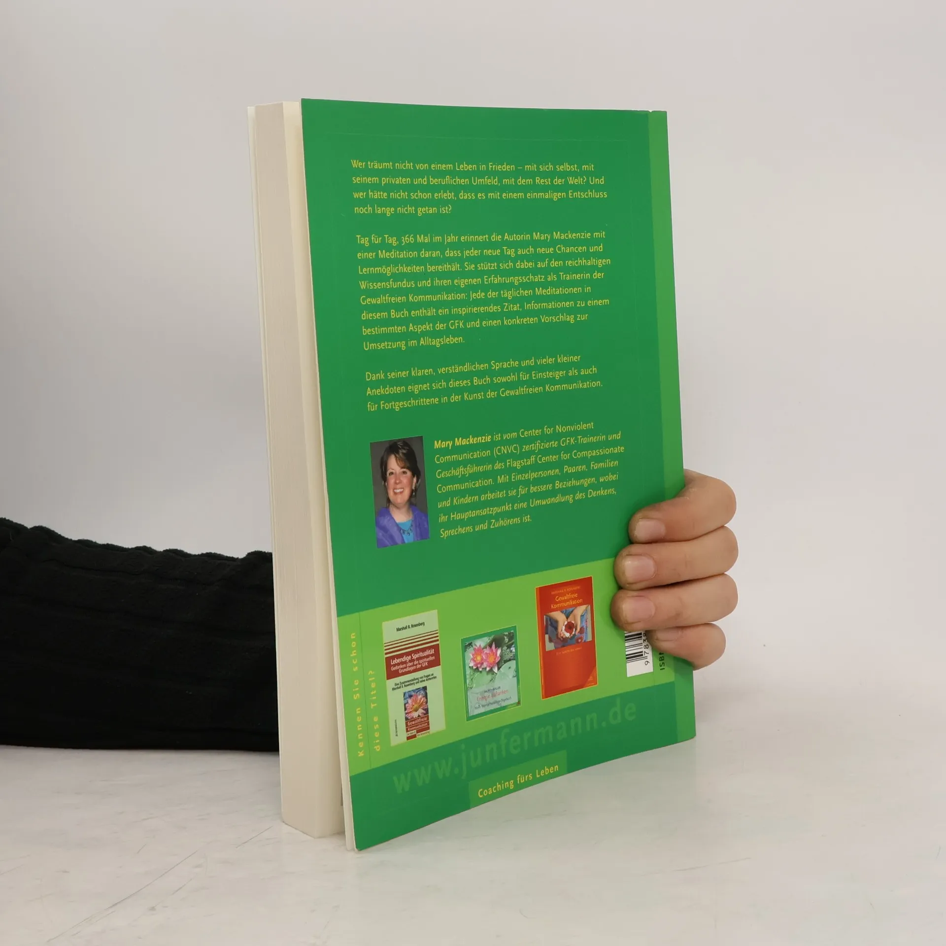Wer träumt nicht von einem Leben in Frieden - mit sich selbst, mit seinem privaten und beruflichen Umfeld, mit dem Rest der Welt? Und wer hätte nicht schon erlebt, dass es mit einem einmaligen Entschluss noch lange nicht getan ist? Tag für Tag, 366-mal im Jahr erinnert die Autorin Mary Mackenzie mit einer Meditation daran, dass jeder neue Tag auch neue Chancen und Lernmöglichkeiten bereithält. Sie stützt sich dabei auf den reichhaltigen Wissensfundus und ihren eigenen Erfahrungsschatz als Trainerin der Gewaltfreien Kommunikation: Jede der täglichen Meditationen in diesem Buch enthält ein inspirierendes Zitat, Informationen zu einem bestimmten Aspekt der GFK und einen konkreten Vorschlag zur Umsetzung im Alltagsleben. Dank seiner klaren, verständlichen Sprache und vieler kleiner Anekdoten eignet sich dieses Buch sowohl für Einsteiger als auch für Fortgeschrittene in der Kunst der Gewaltfreien Kommunikation. Viele kleine Schritte für eine große Sache, denn: „Mit jedem Schritt, den wir machen, mit jedem Moment, in dem wir uns dafür entscheiden, unsere Kinder oder die Verkäuferin nicht anzuschnauzen, mit jeder Situation, in der wir die Bedürfnisse eines anderen berücksichtigen, rückt der Weltfrieden näher. Es ist unvermeidlich.“ - Mary Mackenzie