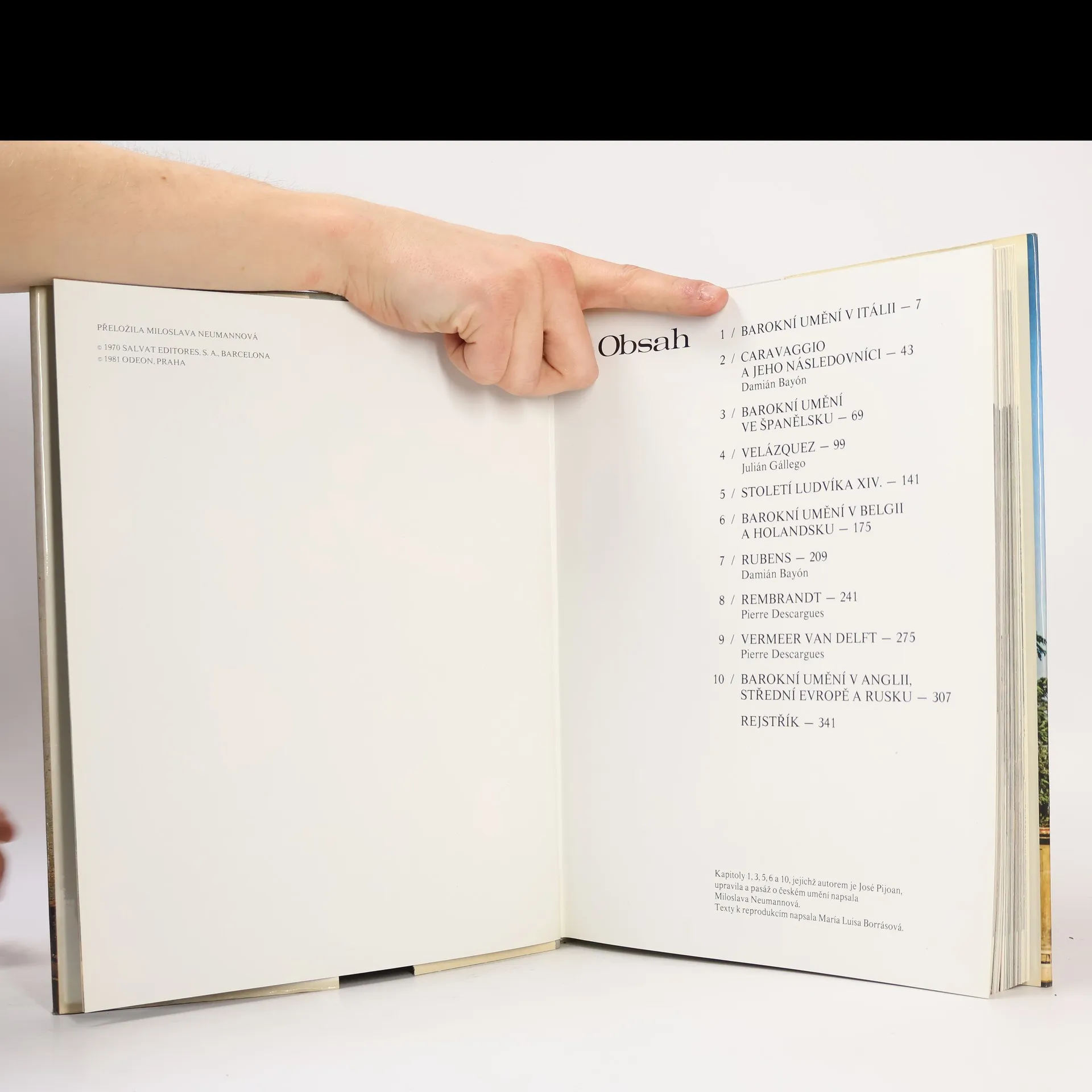 Sedmým dílem dospívá Pijoanova encyklopedie k 17. století, pro něž je charakteristický barokní umělecký sloh. Rozvíjel se v souvislosti s protireformací a na podkladě principů protikladných estetice renesance. Vznikala dynamická díla, namísto racionální uměřenosti nastoupil patos. V Itálii, zemi zrodu baroka, se však objevil i bezprostřednější vztah ke skutečnosti více „realistickým“ viděním každodenního života, jak dokazují četné podobizny, krajiny, všední výjevy i zátiší. Podobně se vyvíjelo umění měšťanského Holandska, jinak kvetlo barokní umění ve Francii a dalších evropských zemích. Pasáž věnovaná Čechám je v tomto vydání podstatně rozšířena, jak to odpovídá významu českého baroka. V obrazové části se setkáte s 299 barevnými reprodukcemi řady proslulých děl, mezi jejichž autory jsou zastoupena jména jako Caravaggio, Velázquez, van Dyck, Rubens, Vermeer či Rembrandt.
