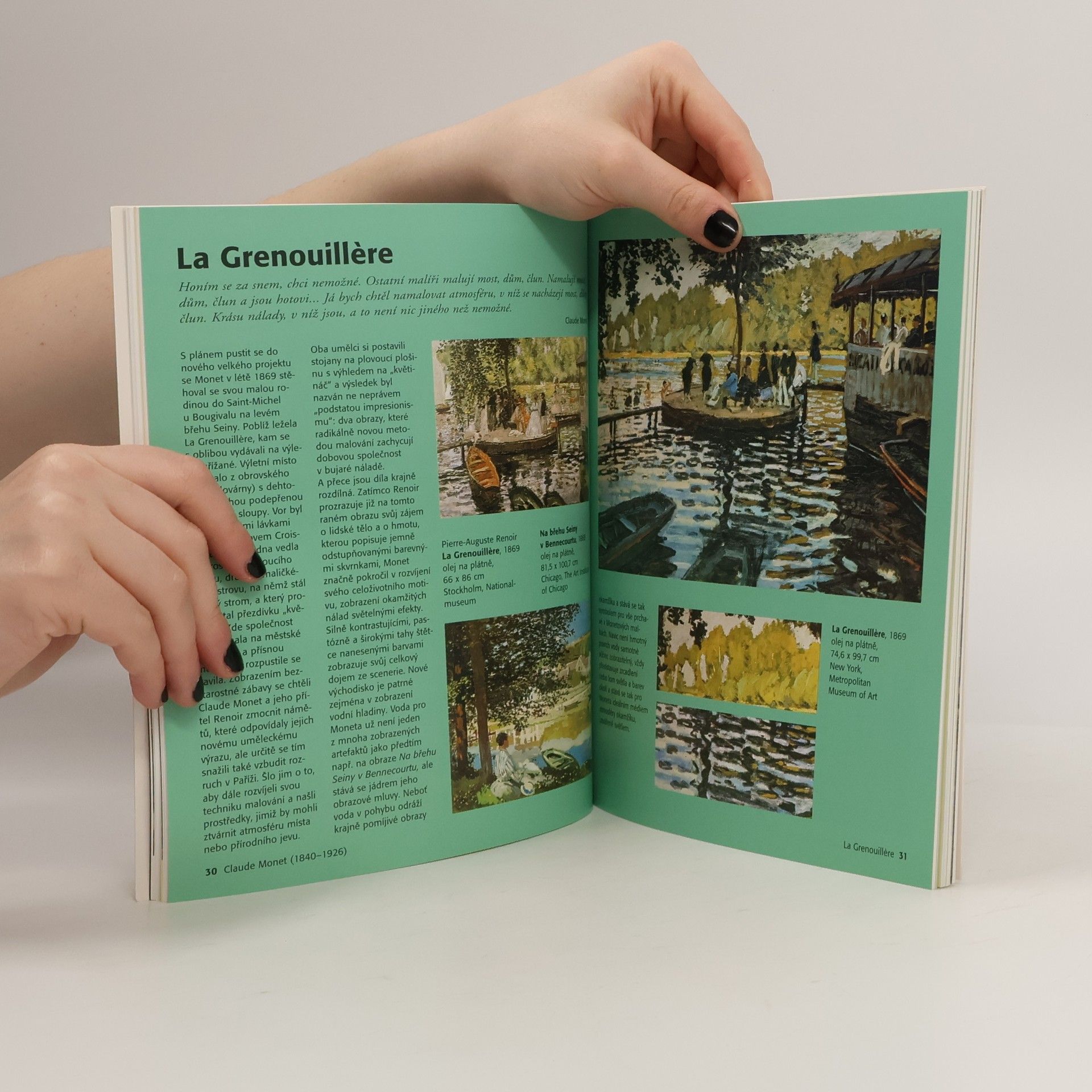 Přehledný průvodce malířským dílem Claude Moneta, který začínal karikováním svých spolužáků a učitelů, až dosáhl takové zručnosti, že si po studiích začal takto vydělávat. Patrně by v tomto pokračoval, kdyby jej malíř Eugene Boudin v roce 1858 nezískal pro krajinomalbu. To určilo další směr umělecké dráhy mladého Moneta.