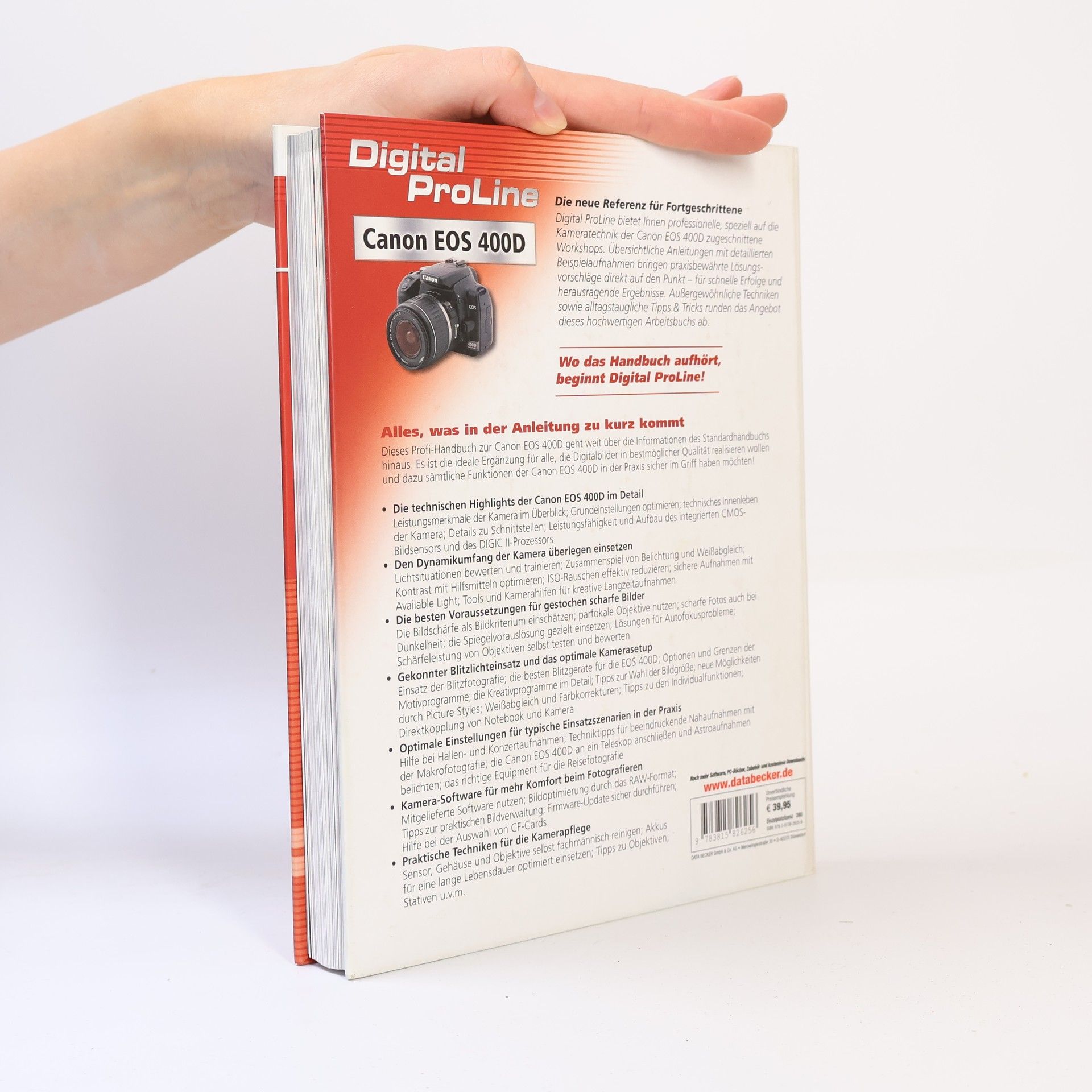 Maximale Qualität herausholen§Mit Digital ProLine beherrschen Sie die Fähigkeiten Ihrer wertvollen Canon EOS 400D auch in Grenzsituationen sicher, denn die Reihe setzt dort an, wo die Originalanleitung des Herstellers aufhört. So kurz wie möglich und so ausführlich wie nötig zeigen Ihnen speziell auf Ihre digitale Spiegelreflexkamera zugeschnittene Workshops, wie Sie konkrete Anwendungsprobleme ohne Umwege lösen und immer das Maximum an Qualität aus Ihren Fotos herausholen. Detaillierte Beispielaufnahmen und kompakte Praxisanleitungen zu typischen Einsatzszenarien, Bildoptimierung, Kamerapflege u.a. bringen genau das auf den Punkt, was für ambitionierte Digitalfotografen wirklich wichtig ist.§§Kamera sicher beherrschen§Ob alltagstaugliche Grundeinstellungen, Hintergrundwissen zum technischen Innenleben der EOS 400D oder Informationen zu Bildschärfe, Kontrast und Belichtungssteuerung: In übersichtlich gestalteten Kapiteln bekommen interessierte Leser/innen anspruchsvolle Tricks und Kniffe, um die Kamera in allen erdenklichen Situationen sicher zu beherrschen. Außergewöhnliche Techniken, Tipps für den Kauf von Zubehör sowie zahlreiche Testcharts zum Abfotografieren runden das Angebot dieses hochwertigen Arbeitsbuchs ab.