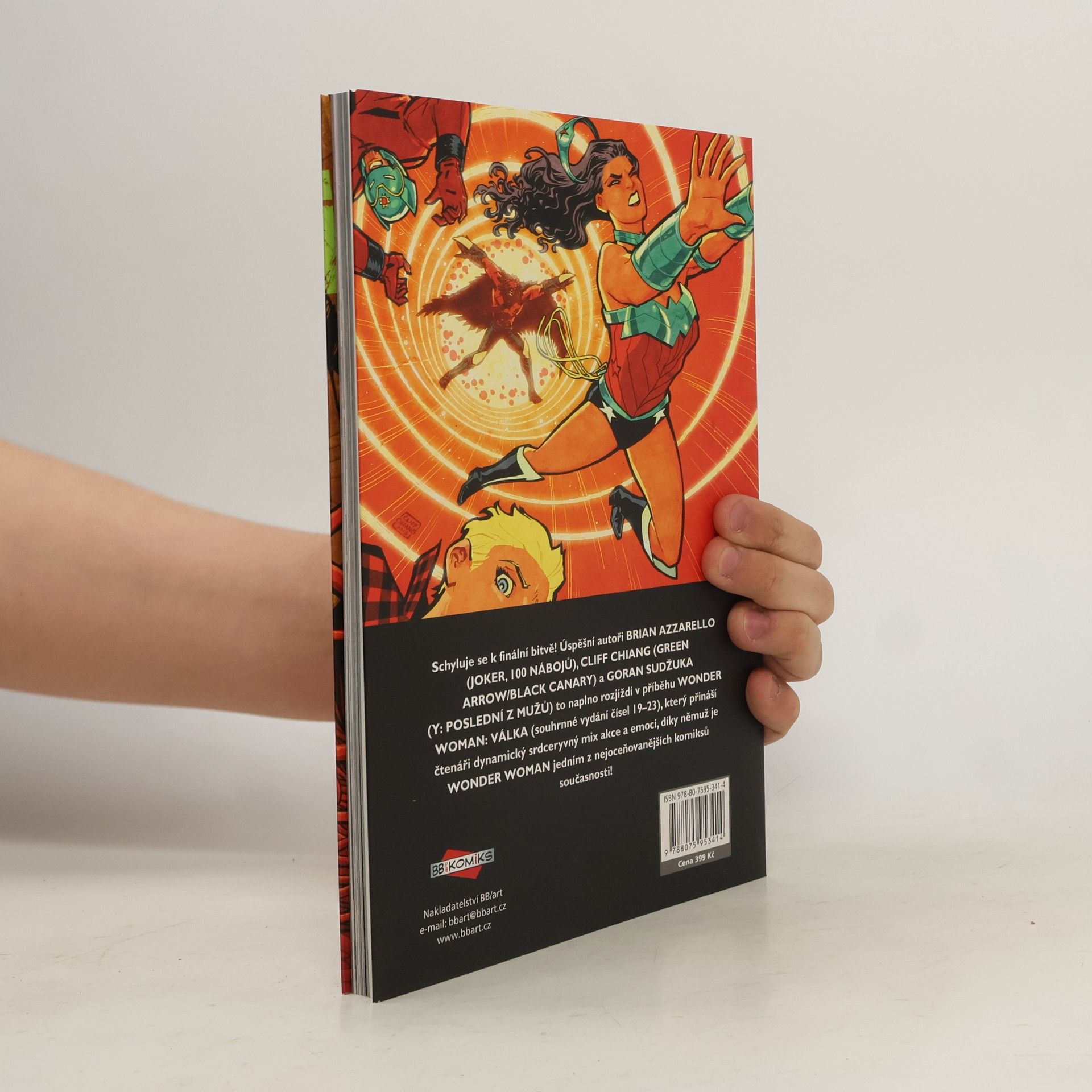 Zeus, otec Wonder Woman, někam zmizel. Její rodina - tety a strýcové, bratry a sestry, bohové a polobohové - tvoří panteon nejmocnějších bytostí ve vesmíru. Chtějí usednout na Diův trůn a jsou pro to ochotni zničit kohokoliv, kdo jim bude stát v cestě, a to včetně Diova syna, který zatím ještě ani neumí mluvit, ale může v sobě může ukrývat moc k rozpoutání apokalypsy. Ale zatímco se Wonder Woman se svými několika málo zbývajícími přáteli snaží ochraňovat život svého nejmladšího bratříčka, na scéně se objevuje starší sourozenec. Bytost známá pouze jako Prvorozený strávila věčnost ve vyhnanství a její síla a vztek rostla s každým dalším tisíciletím. Nyní hodlá spálit na popel Zemi i Olymp, i kdyby to mělo znamenat, že z něho bude král mrtvé říše. Schyluje se k finální bitvě! Úspěšní autoři BRIAN AZZARELLO (JOKER, 100 NÁBOJŮ), CLIFF CHIANG (GREEN ARROW/BLACK CANARY) a GORAN SUDŽUKA (Y: POSLEDNÍ Z MUŽŮ) to naplno rozjíždí v příběhu WONDER WOMAN: VÁLKA (souhrnné vydání čísel 19-23), které přináší čtenáři dynamický srdceryvný mix akce a emocí, díky níž je WONDER WOMAN jedním z nejoceňovanějších komiksů současnosti!