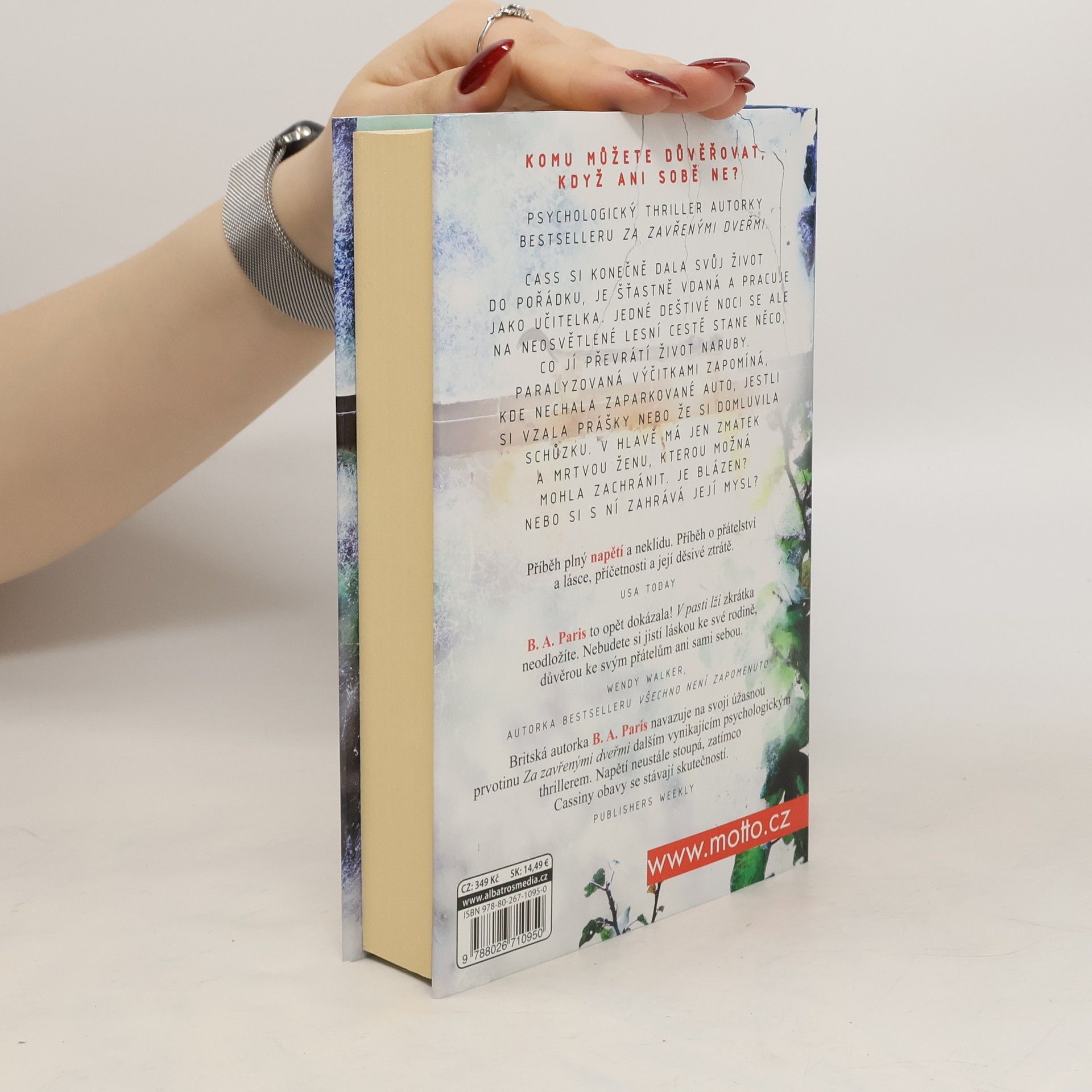 Komu můžete důvěřovat, když ani sobě ne? Psychologický thriller autorky bestselleru Za zavřenými dveřmi. Cass si konečně dala svůj život do pořádku, je šťastně vdaná a pracuje jako učitelka. Jedné deštivé noci se ale na neosvětlené lesní cestě stane něco, co jí převrátí život naruby. Paralyzovaná výčitkami zapomíná, kde nechala zaparkované auto, jestli si vzala prášky nebo že si domluvila schůzku. V hlavě má jen zmatek a mrtvou ženu, kterou možná mohla zachránit. Je blázen? Nebo si s ní zahrává její mysl? Získaná ocenění: Goodreads Choice Awards, 2016, nominace v kategorii debut roku Goodreads Choice Awards, 2016, nominace v kategorii Best Thriller.