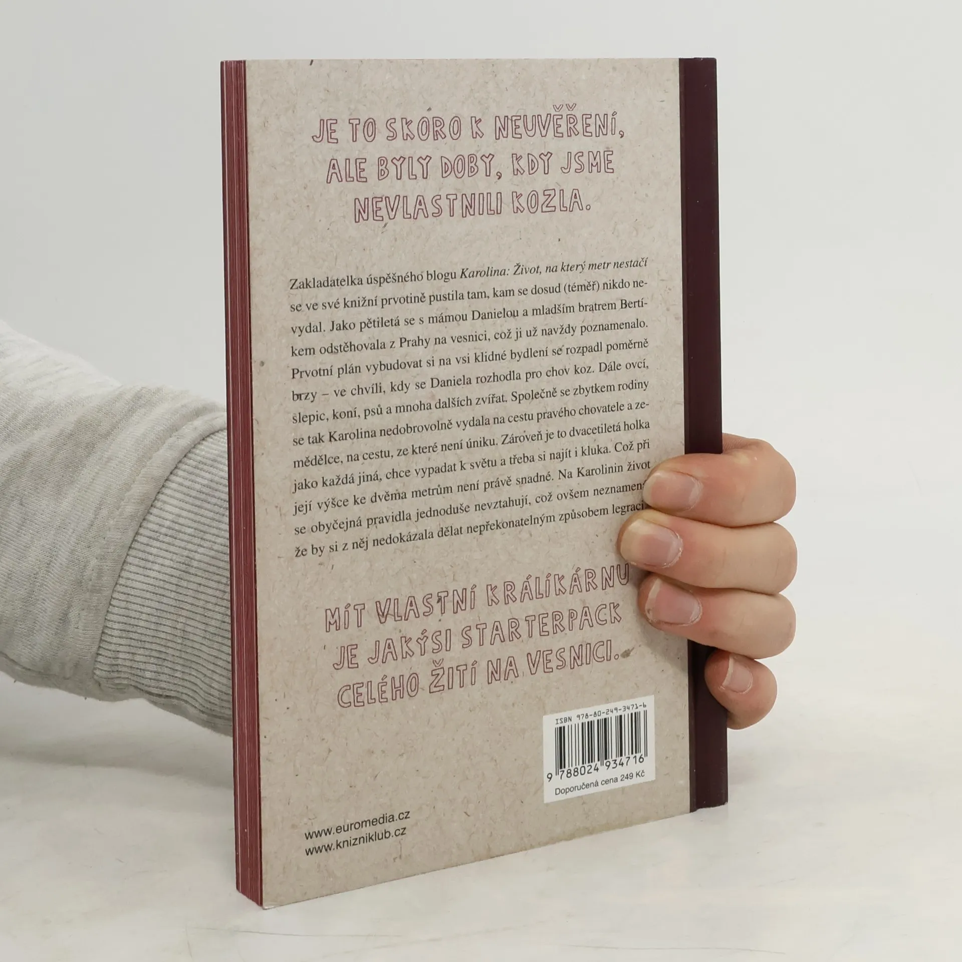 Zakladatelka úspěšného blogu Karolina: Život, na který metr nestačí přichází se stejnojmennou knihou, ve které s nadsázkou úspěšně demonstruje rčení: „Může-li se něco pokazit, pokazí se to.“ Knížka vás provede humornými příběhy z malé vesnice, kam se Karolina nedobrovolně i s rodinou jako malá přestěhovala z Prahy. Prvotní plán vybudovat si na vesnici klidné bydlení, se rozpadl poměrně brzy – ve chvíli, kdy se její máma Daniela rozhodla pro chov koz, ovcí, koní a mnoha dalších zvířat. Společně se zbytkem rodiny se tak Karolina vydala na cestu pravého chovatele a zemědělce v jednom, na cestu, ze které není úniku.