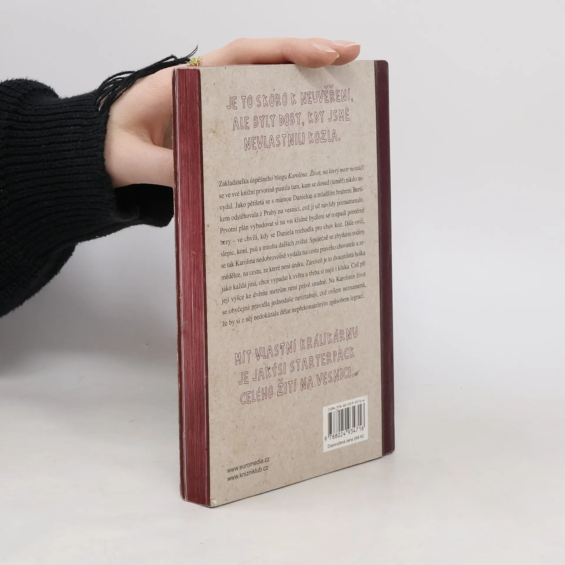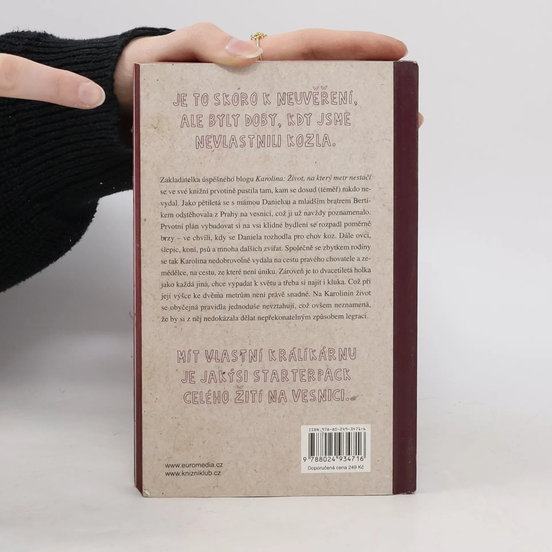 Zakladatelka úspěšného blogu Karolina: Život, na který metr nestačí přichází se stejnojmennou knihou, ve které s nadsázkou úspěšně demonstruje rčení: „Může-li se něco pokazit, pokazí se to.“ Knížka vás provede humornými příběhy z malé vesnice, kam se Karolina nedobrovolně i s rodinou jako malá přestěhovala z Prahy. Prvotní plán vybudovat si na vesnici klidné bydlení, se rozpadl poměrně brzy – ve chvíli, kdy se její máma Daniela rozhodla pro chov koz, ovcí, koní a mnoha dalších zvířat. Společně se zbytkem rodiny se tak Karolina vydala na cestu pravého chovatele a zemědělce v jednom, na cestu, ze které není úniku.