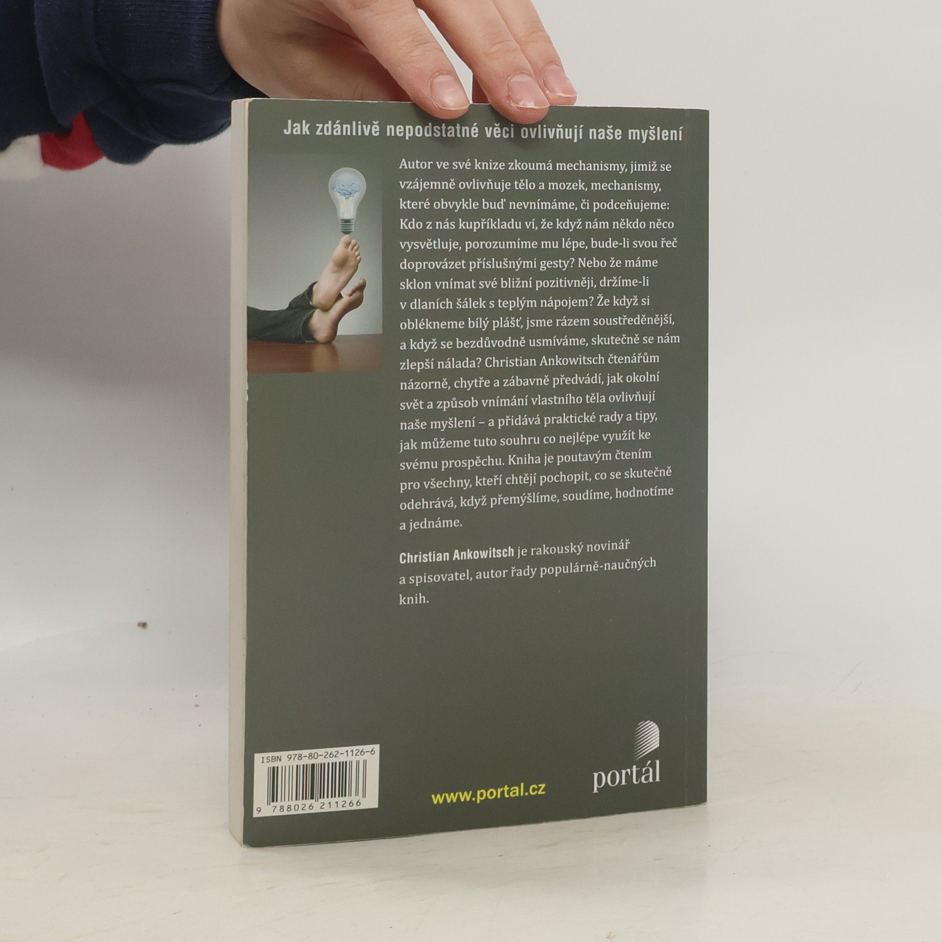 Jak zdánlivě nepodstatné věci ovlivňují naše myšlení – autor v této knize zkoumá mechanismy, jimiž se vzájemně ovlivňuje tělo a mozek, mechanismy, které obvykle buď nevnímáme, nebo podceňujeme: Kdo kupříkladu ví, že když nám někdo něco vysvětluje, porozumíme mu lépe, bude-li svou řeč doprovázet příslušnými gesty? Nebo že máme sklon vnímat své bližní pozitivněji, držíme-li v dlaních šálek s teplým nápojem? Christian Ankowitsch čtenářům názorně, chytře a zábavě předvádí, jak okolní svět a způsob vnímání vlastního těla ovlivňují naše myšlení – a přidává praktické tipy, jak tuto souhru co nejlépe využít k vlastnímu prospěchu. Poutavá kniha pro všechny, kteří chtějí pochopit, co se skutečně odehrává, když přemýšlíme, soudíme, hodnotíme a jednáme.