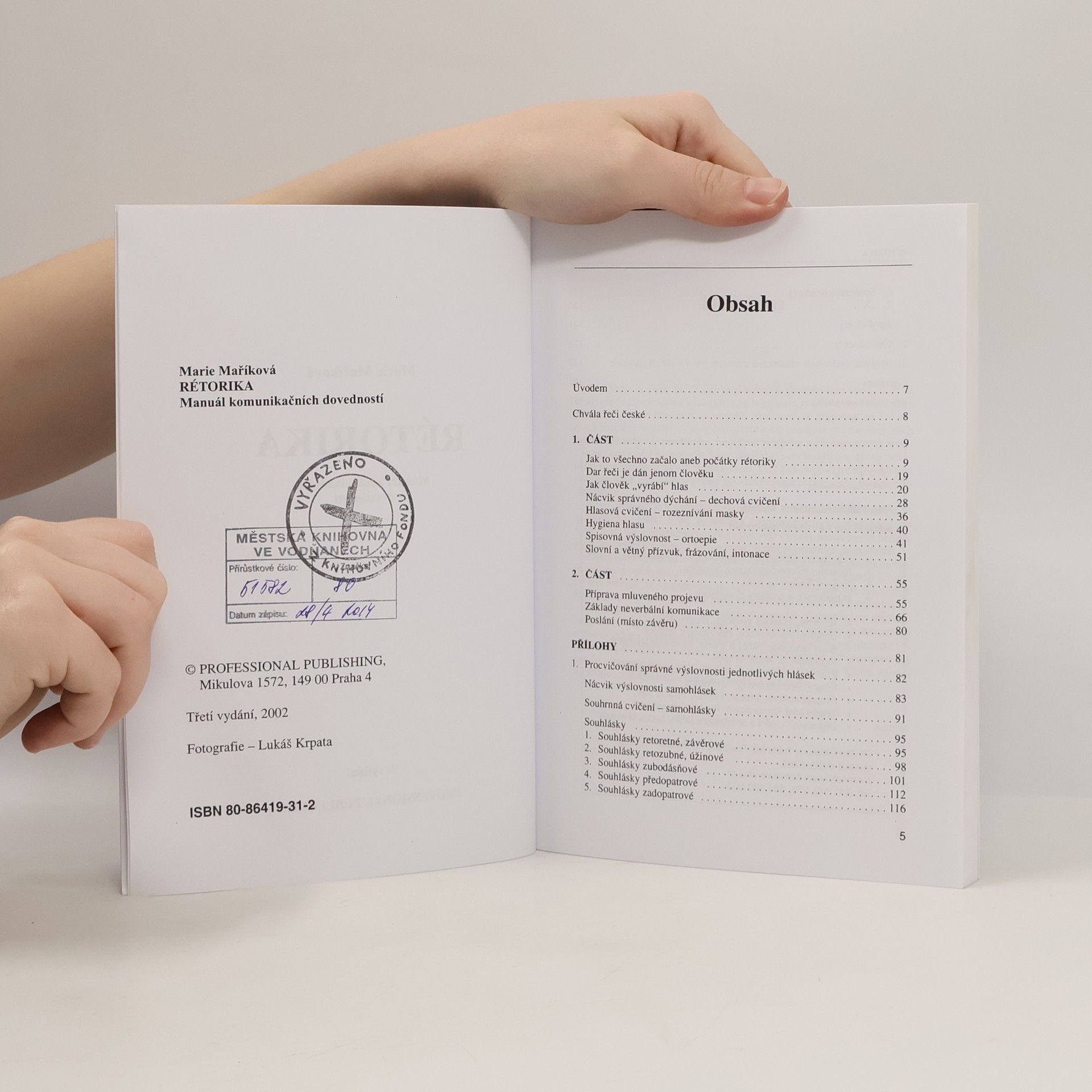 Třetí vydání učebnice, která si klade za cíl konkrétními radami a cvičeními pomoci manažerům, pracovníkům PR a reklamních agentur, moderátorům, lektorům, učitelům, studentům, dealerům, poslancům, všem, kteří ve své práci vystupují na veřejnosti, při výuce správného a příjemného mluveného projevu. Zkušená autorka, rozhlasová hlasatelka a učitelka rétoriky a komunikačních dovedností Marie Maříková, napsala skutečnou učebnici rétoriky, která nejen že seznamuje s historií a současností rétoriky, ale především přináší mnoho originálních a praktických cvičení, vedoucích od správného dýchání přes rozeznívání masky, nácvik spisovné výslovnosti, slovního a větného přízvuku, frázování a intonace, až po konkrétní přípravu mluveného projevu a nácvik používání prvků neverbální komunikace. Každá hláska českého jazyka má v učebnici svá cvičení, jejichž pomocí (včetně populárních jazykolamů) mohou uživatelé pečovat o rozvoj správné výslovnosti a kultivovaný mluvený projev. Závěr knihy tvoří cvičné texty pro komplexní nácvik správného a přesvědčivého veřejného mluveného projevu. Jistě oceníte i přehled správné výslovnosti vlastních a místních jmen v cizích jazycích.