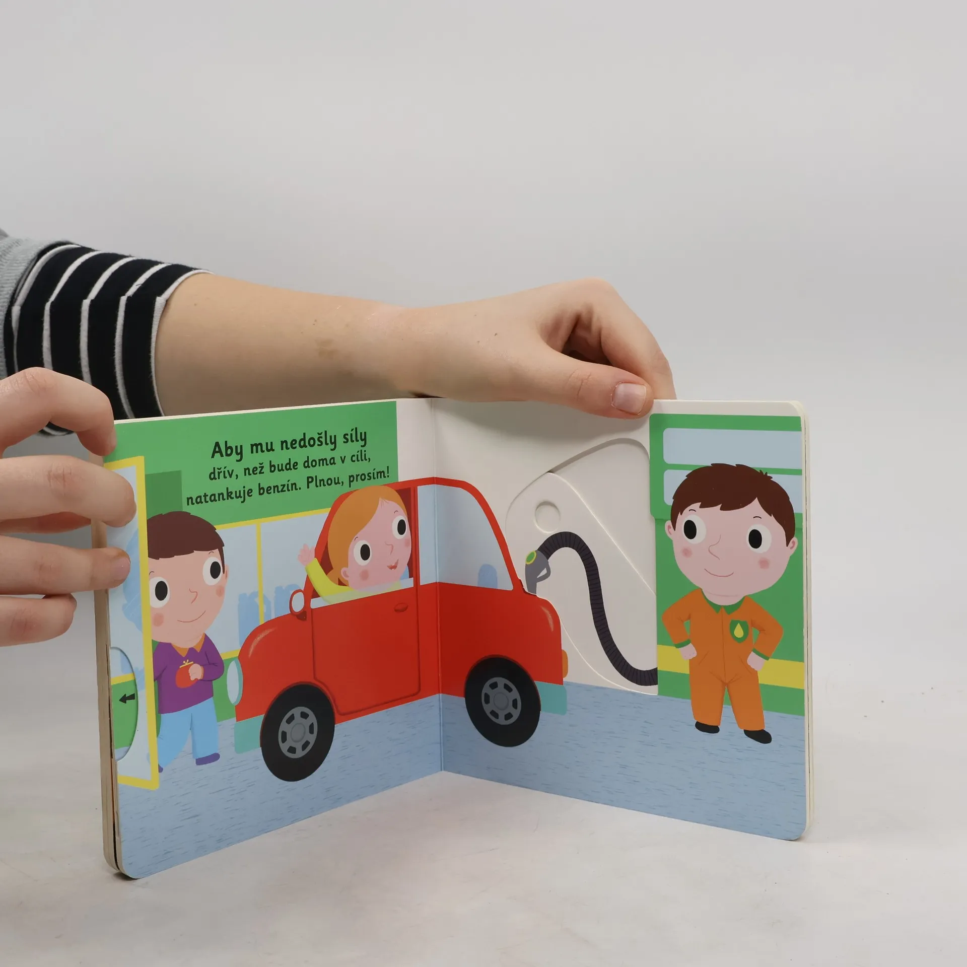 Autíčko má velký den – vyjede si s lidmi ven. Objevovat svět s tímto leporelem pro nejmenší děti od jednoho roku je tak zábavné! Pevné stránky s pohyblivými prvky procvičí i jemnou motoriku. Stačí jen vložit prstík do správného otvoru a lehce vysunout, zatáhnout nebo otočit a hned bude váš malý objevitel znát odpovědi. Knížka s prvky Montessori.
