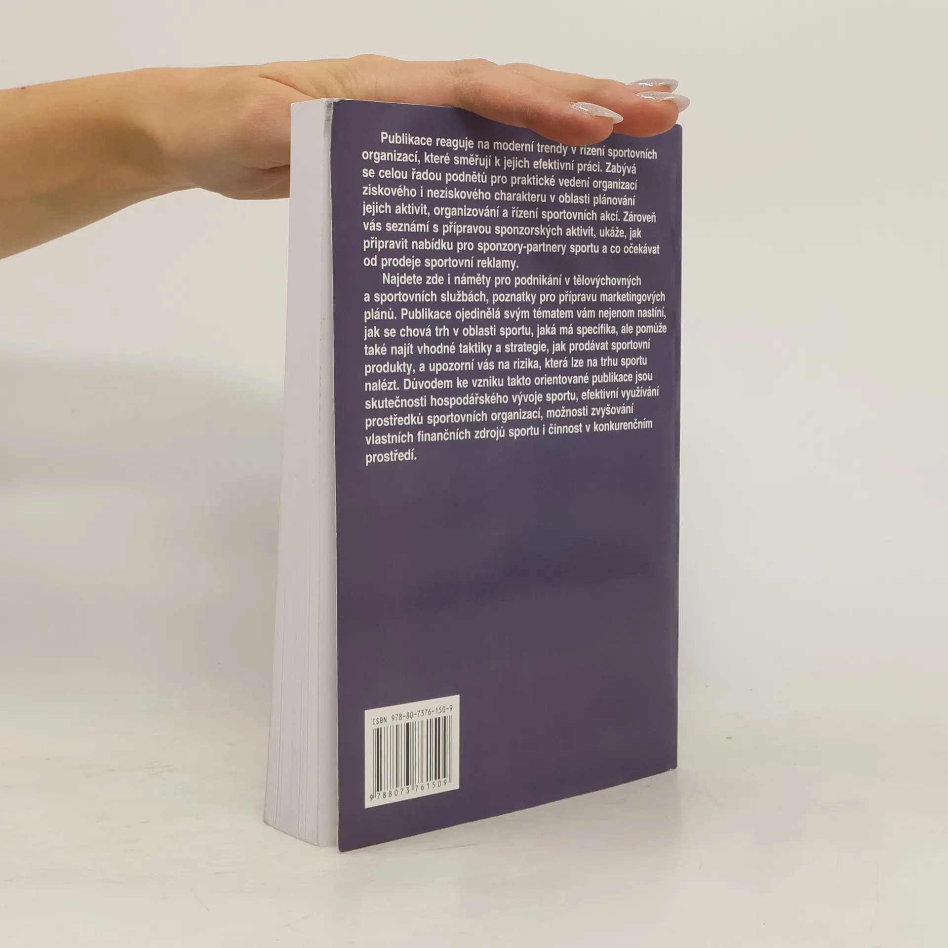 Publikace reaguje na moderní trendy v řízení sportovních organizací, které směřují k jejich efektivní práci. Zabývá se celou řadou podnětů pro praktické vedení organizací ziskového i neziskového charakteru v oblasti plánování jejich aktivit, ukáže, jak připravit nabídku pro sponzory-partnery a co očekávat od prodeje sportovní reklamy. Najdete zde i náměty pro podnikání v tělovýchovných a sportovních službách, poznatky pro přípravu marketingových plánů. Publikace ojedinělá svým tématem vám nejenom nastíní, jak se chová trh v oblasti sportu, jaká má specifika , ale pomůže také najít vhodné taktiky a strategie, jak prodávat sportovní produkty, a upozorní vás na rizika, která lze na trhu sportu nalézt.