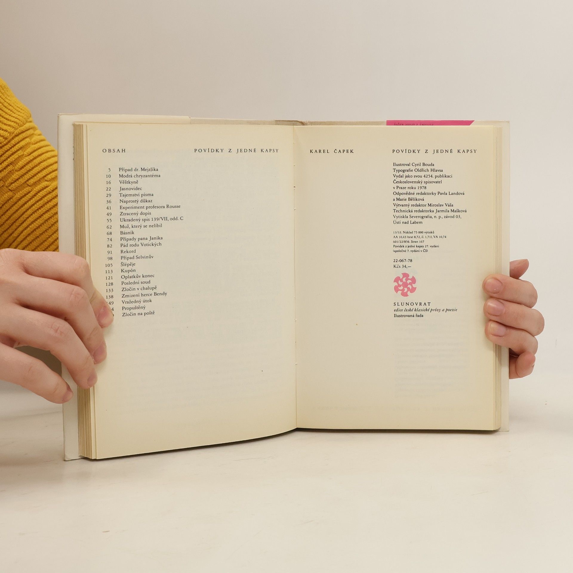 Povídek z jedné kapsy 27. vyd., Povídek z druhé kapsy 21. vyd., (Společné 7. vyd. v ČS). Tisk zvratmo. Sborník detektivních povídek z pera Karla Čapka patří ke skvostům české moderní prózy a právem náleží do zlatého fondu české literatury. Příběhy s kriminální zápletkou autor povýšil na studie člověčenství, které dokáží vždy překvapit a zaujmout. Náměty povídek jsou natolik originální, že byly mnohokrát použity pro filmové zpracování. Klasická díla Karla Čapka jsou ozdobou každé knihovny!