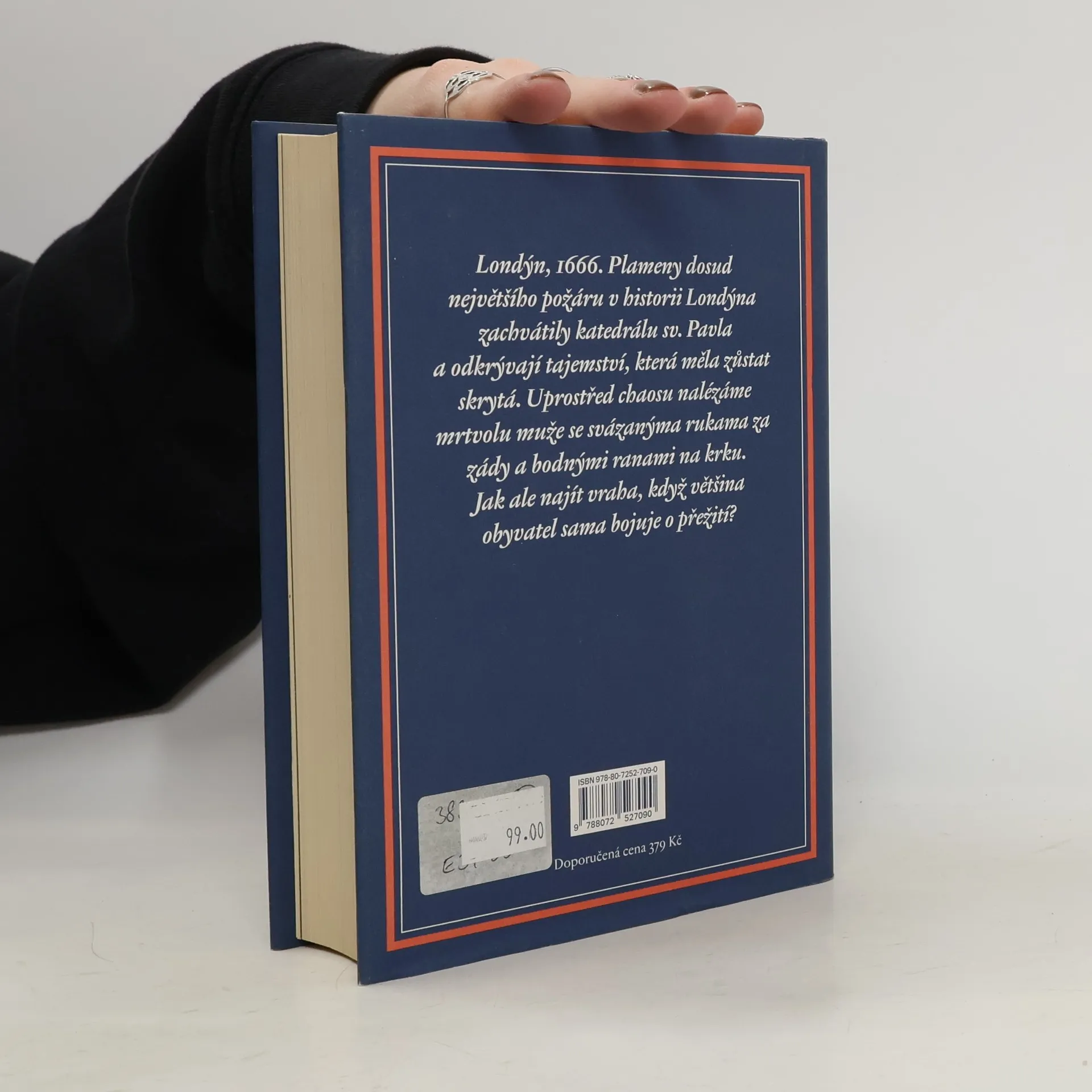 Řádění vraha na pozadí ničivého požáru Strhující krimi v historických kulisách Londýna Londýn, 1666. Plameny dosud největšího požáru v historii Londýna zachvátily katedrálu sv. Pavla a odkrývají tajemství, která měla zůstat skrytá. Uprostřed chaosu nalézáme mrtvolu muže se svázanýma rukama za zády a bodnými ranami na krku. Jak ale najít vraha, když většina obyvatel sama bojuje o přežití? Všemu přihlíží James Marwood, syn odsouzeného zrádce a neochotný vládní informátor, který je donucen pachatele najít. Marwood je brzy vehnán do mimořádného nebezpečí, ale i náruče záhadné mladé ženy, kterou před plameny zachránil. Řádění vraha však ještě není u konce a další oběť na sebe nenechá dlouho čekat. Andrew Taylor je nejuznávanějším britským autorem žánru historické krimi.