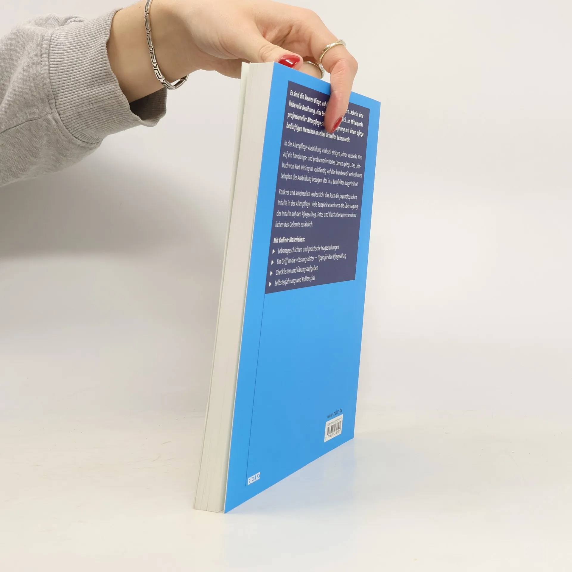 Es sind die kleinen Dinge, die zählen: ein Lächeln, eine liebevolle Berührung, eine Ermutigung, ein Blick. Im Zentrum der Altenpflege steht die Begegnung mit pflegebedürftigen Menschen in ihrer Lebenswelt. Das Buch behandelt psychologisches Wissen für die Altenpflege und die Inhalte der generalistischen Pflegeausbildung gemäß dem Pflegeberufegesetz 2020. Es thematisiert professionelle Herausforderungen in der Altenpflege und die Bedeutung der persönlichen Begegnung zwischen Pflegekräften und Pflegebedürftigen. Konkret und anschaulich werden psychologische Inhalte entsprechend den Rahmenplänen dargestellt. Viele Beispiele erleichtern den Transfer in den Pflegealltag, während Fotos und Illustrationen die Inhalte veranschaulichen. Fragen und Übungen fördern die psychologische Reflexion des eigenen Handelns in der Pflege. Das Buch bietet zusätzlich Online-Material zur Vertiefung, Fallbeispiele und Erfahrungsberichte aus der Praxis sowie Fragen zur Selbstreflexion und Weiterentwicklung. Die Themen umfassen Persönlichkeits- und Entwicklungspsychologie, person-zentrierte Pflege, demenzielle Veränderungen, Biografiearbeit, Wahrnehmungspsychologie, Krisen- und Konfliktmanagement, Zusammenarbeit mit Angehörigen, Psychohygiene, Burn-out und die Psychologie menschlicher Grundbedürfnisse.
