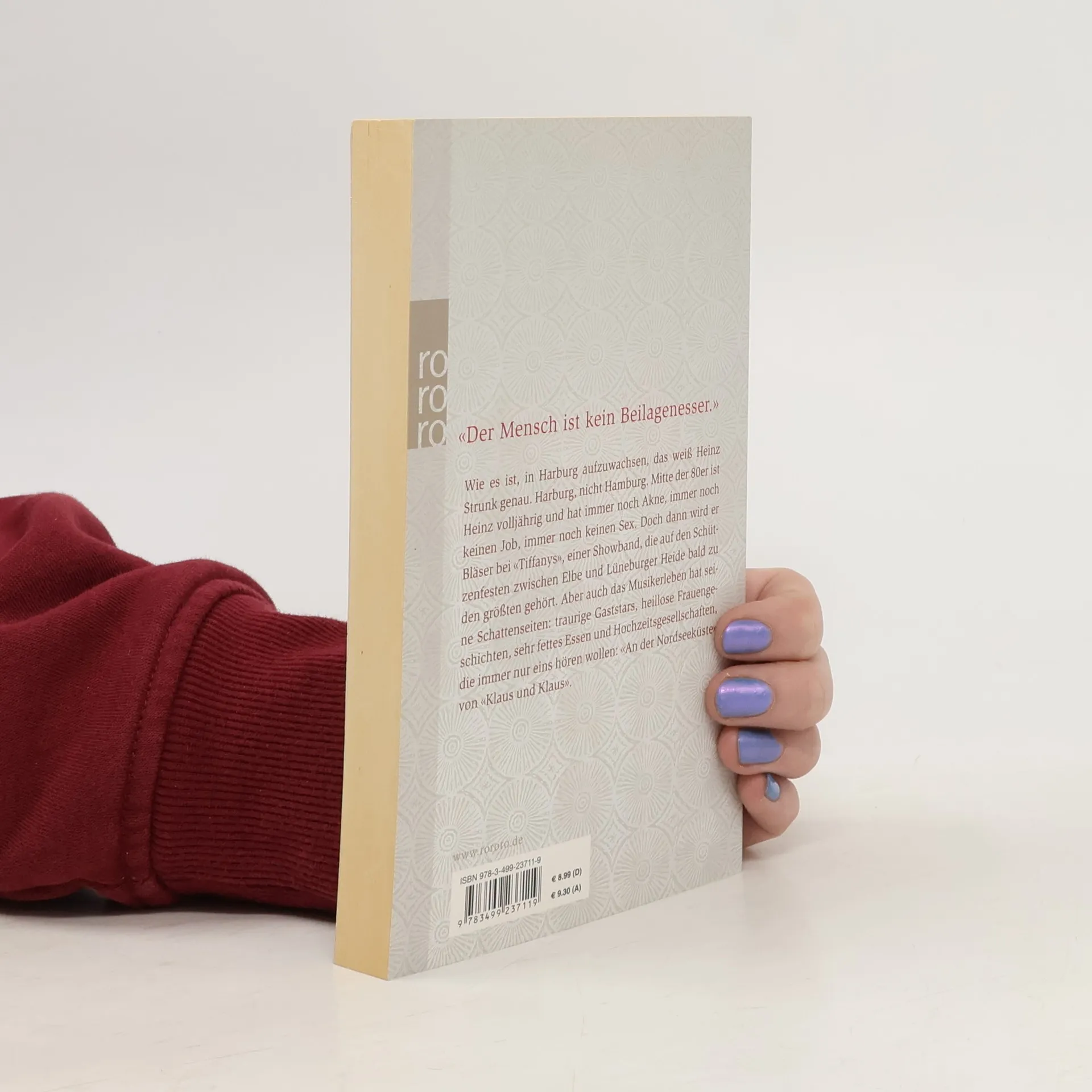 „Der Mensch ist kein Beilagenesser.“ Wie es ist, in Harburg aufzuwachsen, das weiß Heinz Strunk genau. Harburg, nicht Hamburg. Mitte der 80er ist Heinz volljährig und hat immer noch Akne, immer noch keinen Job, immer noch keinen Sex. Doch dann wird er Bläser bei Tiffanys, einer Showband, die auf den Schützenfesten zwischen Elbe und Lüneburger Heide bald zu den größten gehört. Aber auch das Musikerleben hat seine Schattenseiten: traurige Gaststars, heillose Frauengeschichten, sehr fettes Essen und Hochzeitsgesellschaften, die immer nur eins hören wollen: „An der Nordseeküste“ von Klaus und Klaus.
