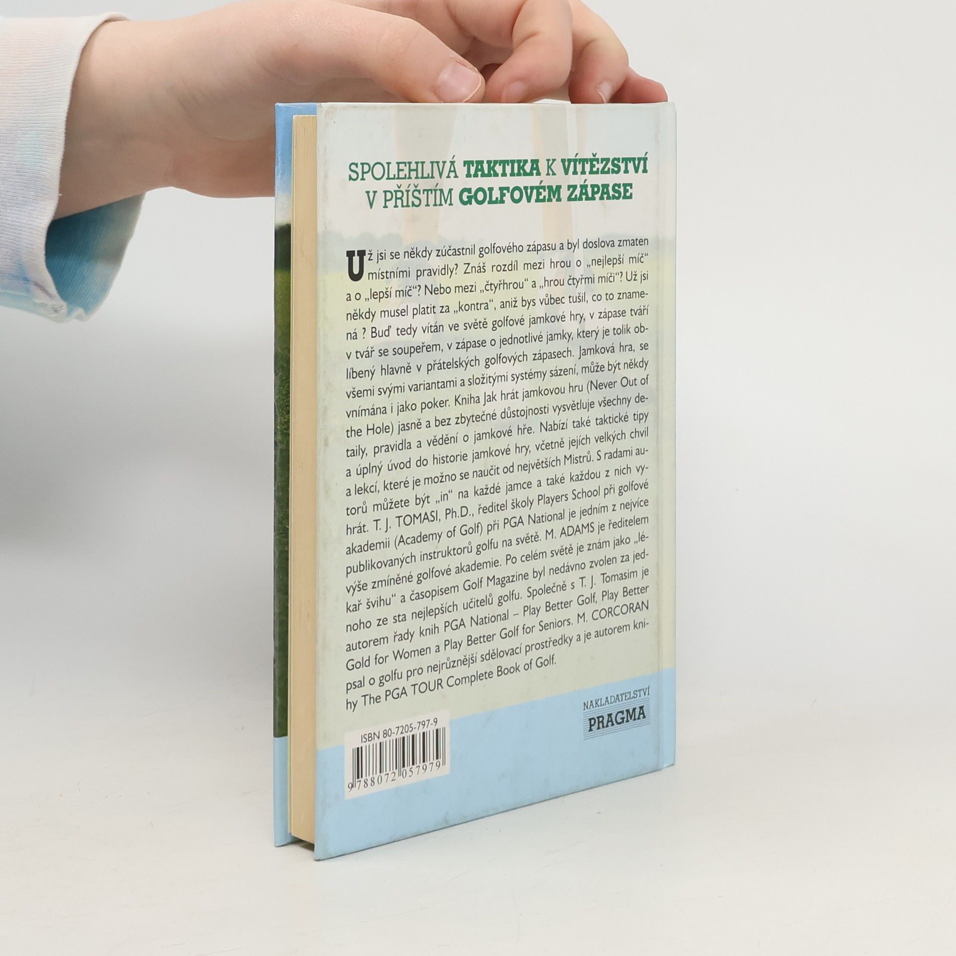 Už jsi se někdy zúčastnil golfového zápasu a byl doslova zmaten místními pravidly ? Znáš rozdíl mezi hrou o "nejlepší míč" a o "lepší míč" ? Nebo mezi "čtyřhrou" a "hrou čtyřmi míči" ? Už jsi někdy musel platit za "kontra", aniž bys vůbec tušil, co to znamená ? Tato kniha jasně a bez zbytečné důstojnosti vysvětluje všechny detaily, pravidla a vědění o jamkové hře. Nabízí také taktické tipy a úplný úvod do historie jamkové hry, včetně jejích velkých chvil a lekcí, které je možno se naučit od jejích největších Mistrů.