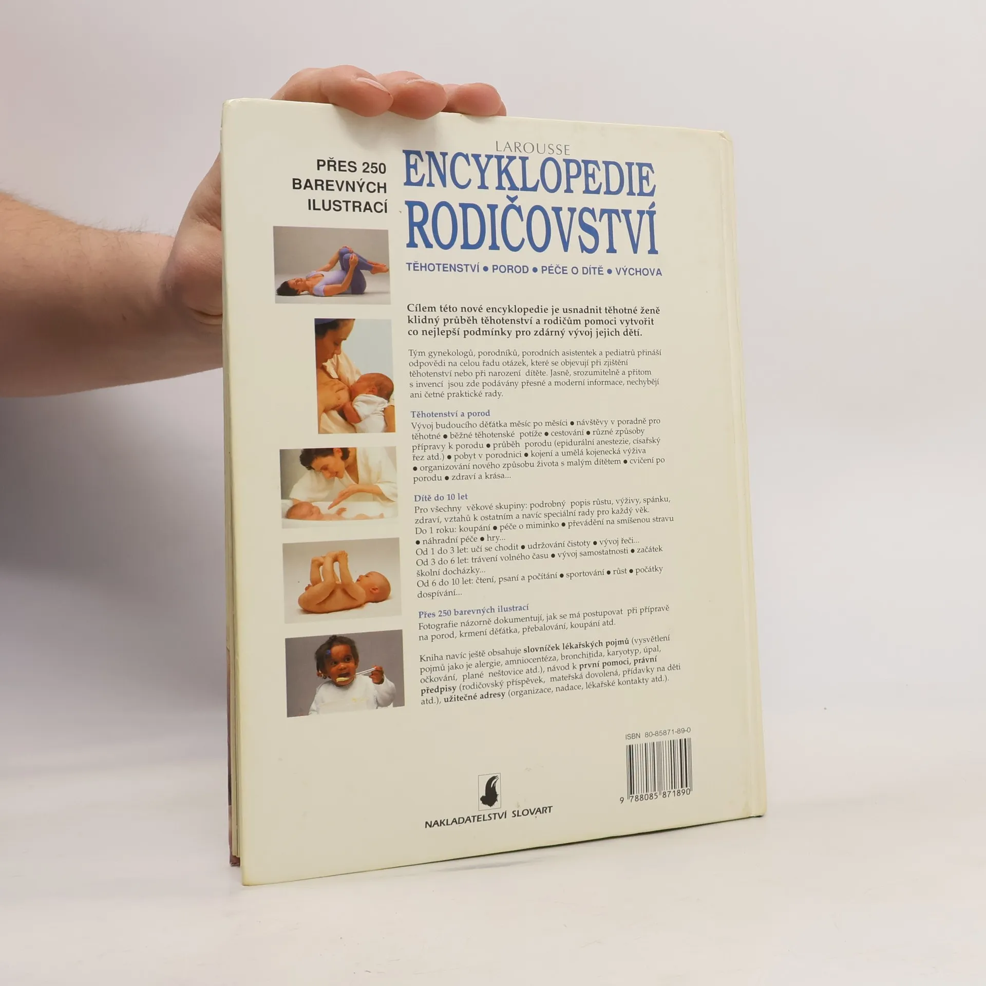 Cílem této encyklopedie je usnadnit těhotným ženám klidný průběh těhotenství a rodičům vytvořit ideální podmínky pro vývoj dětí. Tým odborníků přináší odpovědi na otázky spojené s těhotenstvím a narozením dítěte. Text je jasný, srozumitelný a obsahuje moderní informace spolu s praktickými radami. Obsahuje témata jako vývoj dítěte měsíc po měsíci, návštěvy v poradně, běžné těhotenské potíže, cestování, příprava k porodu, průběh porodu, pobyt v porodnici, kojení a organizaci života s malým dítětem. Pro děti do 10 let je zde podrobný popis růstu, výživy, spánku a vztahů. Obsahuje rady pro každou věkovou skupinu: do 1 roku (koupání, péče o miminko), od 1 do 3 let (učení chůze, udržování čistoty), od 3 do 6 let (trávení volného času, vývoj samostatnosti) a od 6 do 10 let (čtení, psaní, sportování). Více než 250 barevných ilustrací dokumentuje postupy při přípravě na porod, krmení a koupání dítěte. Kniha obsahuje také slovníček lékařských pojmů, návod k první pomoci, právní předpisy týkající se rodičovství a užitečné kontakty na organizace a lékaře.