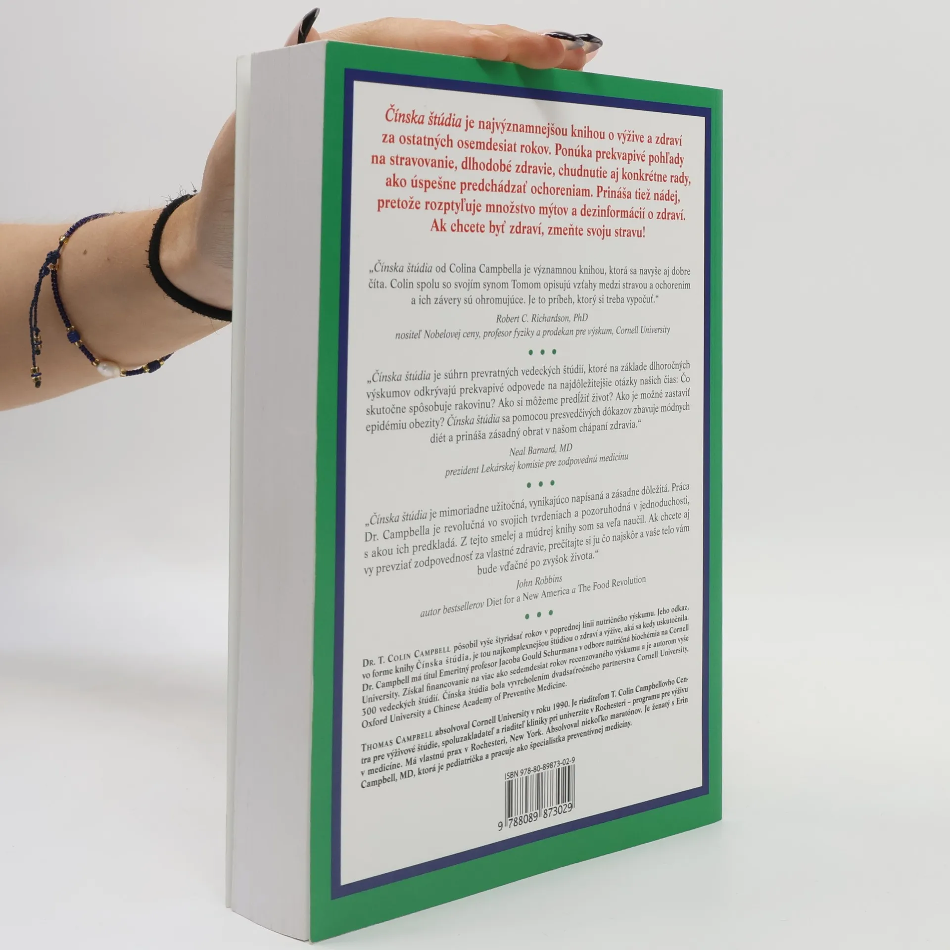 Čínska štúdia je najvýznamnejšou knihou o výžive a zdraví, aká bola spracovaná za ostatných osemdesiat rokov. Ponúka prekvapivé pohľady na stravovanie, dlhodobé zdravie, chudnutie aj konkrétne rady, ako úspešne predchádzať ochoreniam. Prináša tiež nádej, pretože rozptyľuje množstvo mýtov a dezinformácii o zdraví. Čínska štúdia je mimoriadne užitočná, vynikajúco napísaná a zásadne dôležitá kniha. Práca Dr. Campbella je revolučná vo svojich tvrdeniach a pozoruhodná v jednoduchosti, s akou predkladá výsledky svojho celoživotného výskumu. Je súhrnom prevratných vedeckých štúdií, ktoré poskytujú odpovede na neustále kladené otázky lekármi, vedcami a čitateľmi zaujímajúcimi sa o zdravie. Na základe dôkladných dlhoročných výskumov, ktoré trvali 44 rokov, odkrýva prekvapivé odpovede na tie najdôležitejšie otázky o výžive našich čias: Čo skutočne spôsobuje rakovinu? Ako si môžeme predĺžiť život? Ako zastavíme epidémiu obezity? Čínska štúdia je založená na neoblomnom vedeckom výskume, nie na povrchných špekuláciách a módnych trendoch a spolieha sa na pevné a presvedčivé dôkazy. Upriamuje pozornosť na rozlúsknutie zložitého tajomstva, prečo sa niektorí ľudia tešia lepšiemu zdraviu ako iní. Je napísaná prístupným a zábavným spôsobom.