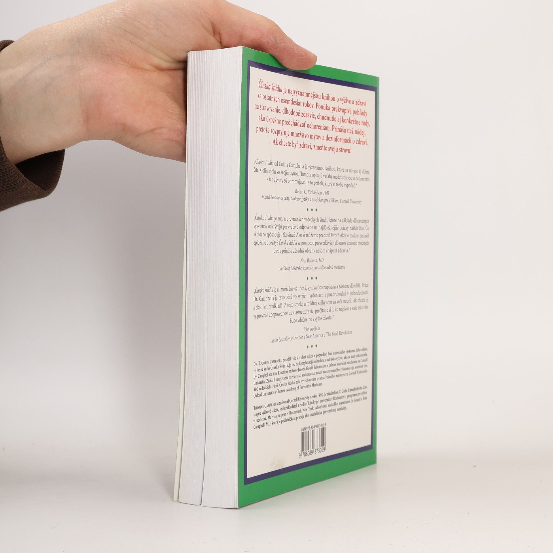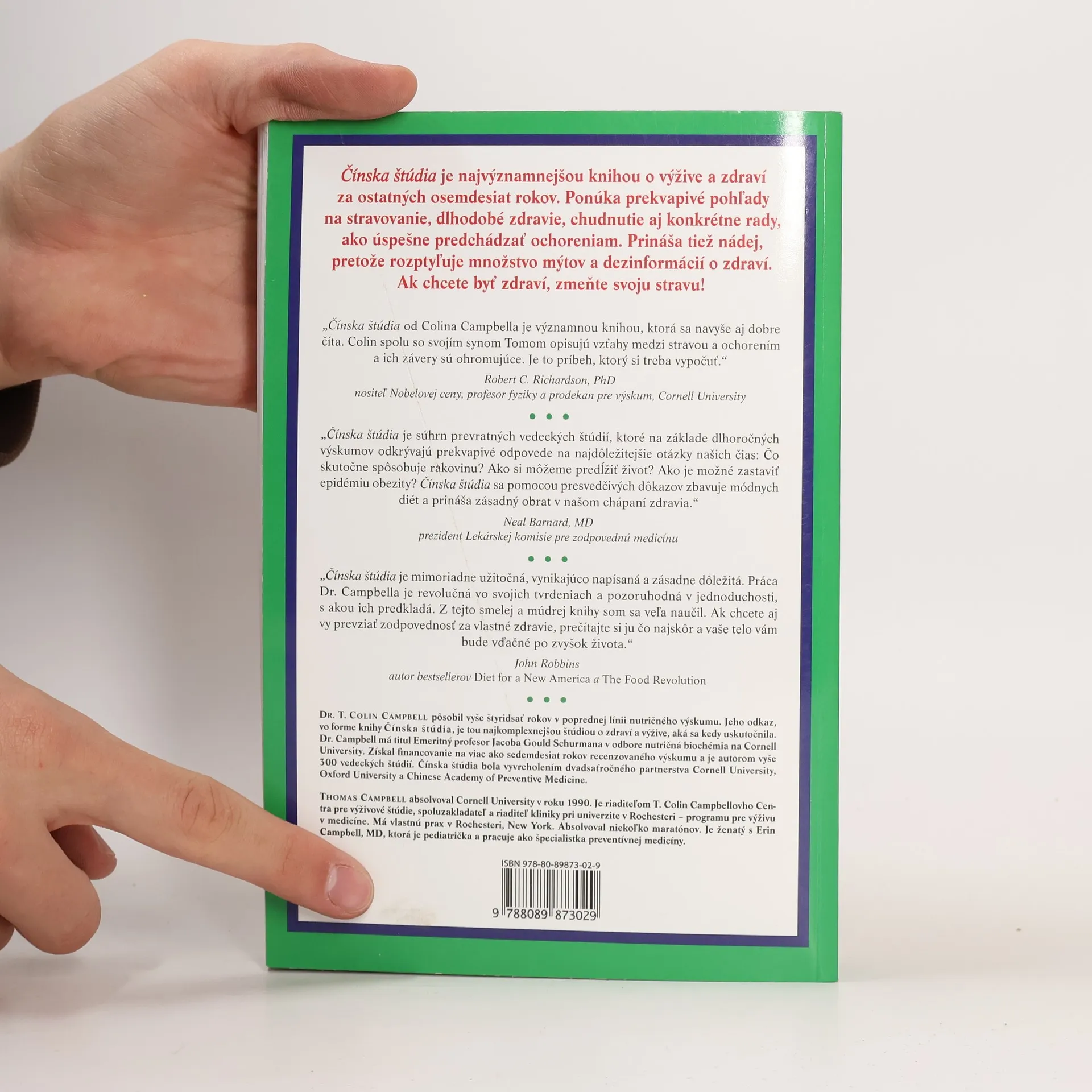 Čínska štúdia je najvýznamnejšou knihou o výžive a zdraví, aká bola spracovaná za ostatných osemdesiat rokov. Ponúka prekvapivé pohľady na stravovanie, dlhodobé zdravie, chudnutie aj konkrétne rady, ako úspešne predchádzať ochoreniam. Prináša tiež nádej, pretože rozptyľuje množstvo mýtov a dezinformácii o zdraví. Čínska štúdia je mimoriadne užitočná, vynikajúco napísaná a zásadne dôležitá kniha. Práca Dr. Campbella je revolučná vo svojich tvrdeniach a pozoruhodná v jednoduchosti, s akou predkladá výsledky svojho celoživotného výskumu. Je súhrnom prevratných vedeckých štúdií, ktoré poskytujú odpovede na neustále kladené otázky lekármi, vedcami a čitateľmi zaujímajúcimi sa o zdravie. Na základe dôkladných dlhoročných výskumov, ktoré trvali 44 rokov, odkrýva prekvapivé odpovede na tie najdôležitejšie otázky o výžive našich čias: Čo skutočne spôsobuje rakovinu? Ako si môžeme predĺžiť život? Ako zastavíme epidémiu obezity? Čínska štúdia je založená na neoblomnom vedeckom výskume, nie na povrchných špekuláciách a módnych trendoch a spolieha sa na pevné a presvedčivé dôkazy. Upriamuje pozornosť na rozlúsknutie zložitého tajomstva, prečo sa niektorí ľudia tešia lepšiemu zdraviu ako iní. Je napísaná prístupným a zábavným spôsobom.