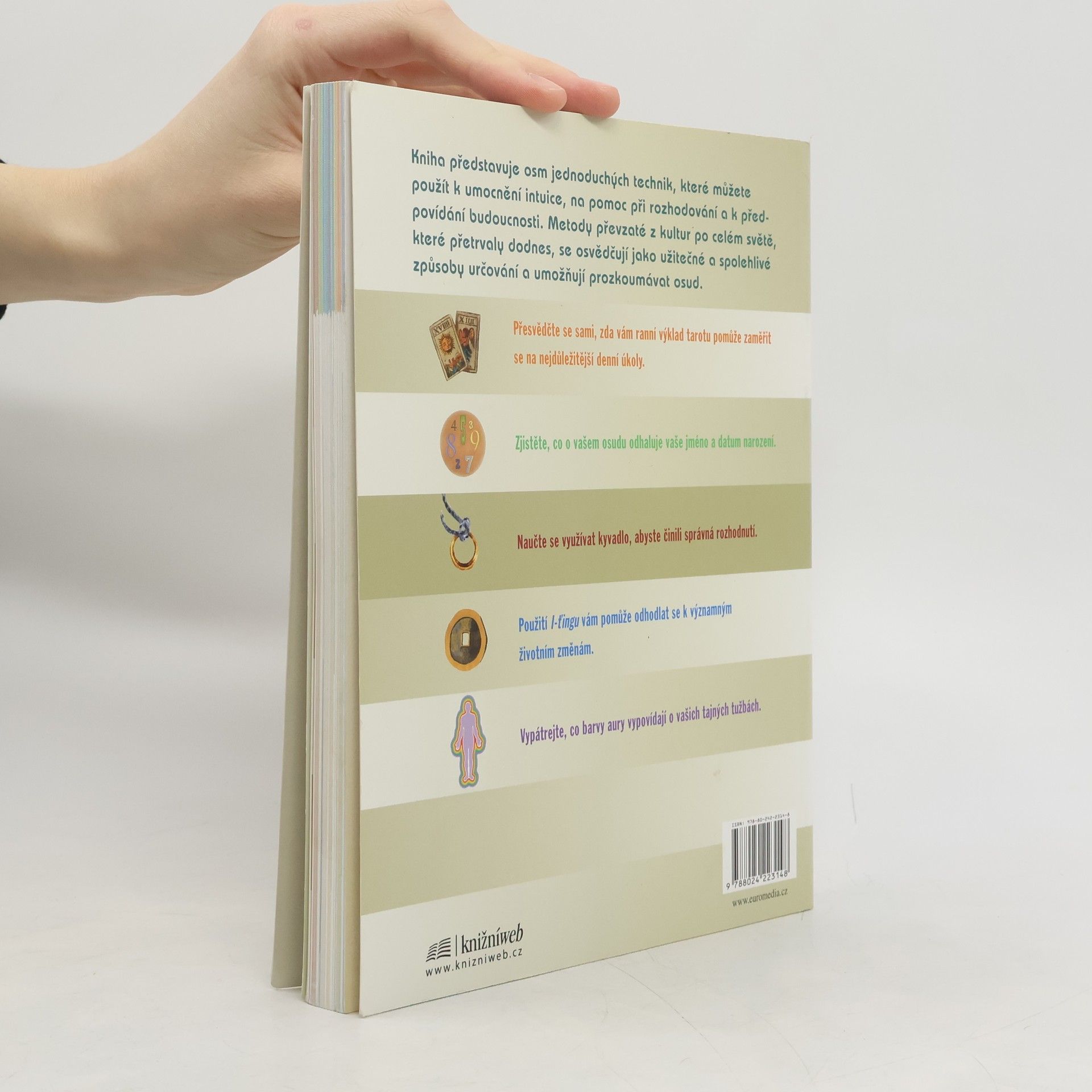 Výborná příručka pro všechny, kteří rádi poodhalují tajemství budoucnosti. Nabízí se mnoho způsobů a tato velmi šikovná knížka seznamuje čtenáře s osmi nejznámějšími. Poskytuje nejenom návod, jak máme postupovat při vykládání tarotu či věštění z run, ale dozvídáme se také, co lze vyčíst z knihy zvané I-ťing, čemu nasvědčují čáry viditelné na dlani a jak můžeme posuzovat auru. Neméně poutavý je výklad o numerologii, používání kyvadla a kamenech zvěrokruhu.