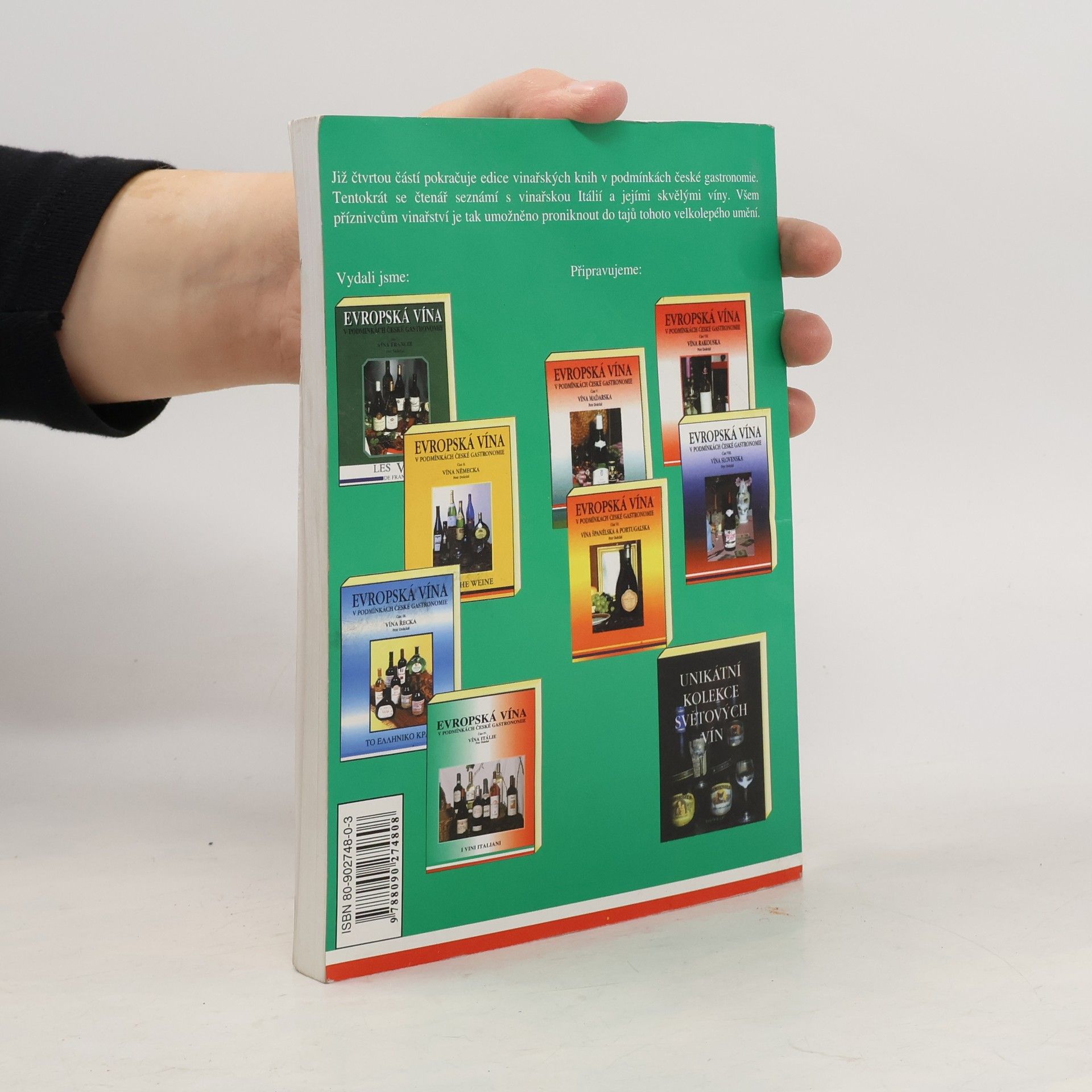 Jedna z nejpřehlednějších knih o italském vinařství, představující velmi srozumitelně vinařství Itálie.Doplněna o soubory všech zařazených vín do jednotlivých jakostních kategorii v Itálii.Kniha vznikla po pobytu autora v Itálii. Kniha je obohacena opět o vědomostní text a jako všechny knihy této edice i o správné výslovnosti. Vysoké ohodnocení od 1.sommelierského kubu v ČR.
