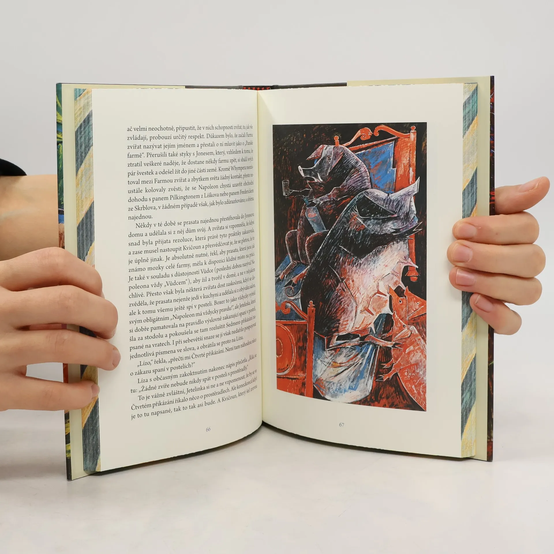 Ilustrované vydání Farmy zvířat obsahuje desítky obrazů ukrajinského malíře Iwana Kulika a dosud nepublikovaný text, v němž autor objasňuje vznik své slavné knihy. Když George Orwell v roce 1944 dokončil svou alegorickou bajku o ruské revoluci a stalinské diktatuře, netušil, že se stane klasikou a povinnou školní četbou. Britští nakladatelé o vydání knihy zpočátku nejevili zájem, neboť byla napsána v době, kdy západní mocnosti spolupracovaly se Sovětským svazem a obávaly se, že by kritika mohla Stalina rozhněvat. Orwell věřil, že spojenectví nebude trvalé, což prorocky vyjádřil v závěrečné scéně, symbolizující konec revolučního idealismu a nástup studené války. Po vyhlášení otevřené studené války se situace obrátila a kniha byla oslavována jako efektivní nástroj antikomunistické propagandy. Americká vláda financovala její překlady do různých jazyků a podporovala jejich distribuci v „rizikových“ zemích. Po Orwellově smrti CIA strategicky zpopularizovala jeho dílo filmem, přičemž animovaný film z roku 1954 byl upraven a plně pod kontrolou autorovy manželky. Autor, který brilantně popisoval totalitní mechanismy, nemohl tušit, že jeho dílo se stane předmětem manipulace. Farmy zvířat se staly nástrojem pro různé politické ideologie, přičemž Orwell chtěl demaskovat sovětský mýtus v zájmu demokratického socialismu. Jaký mýtus by demaskoval dnes?