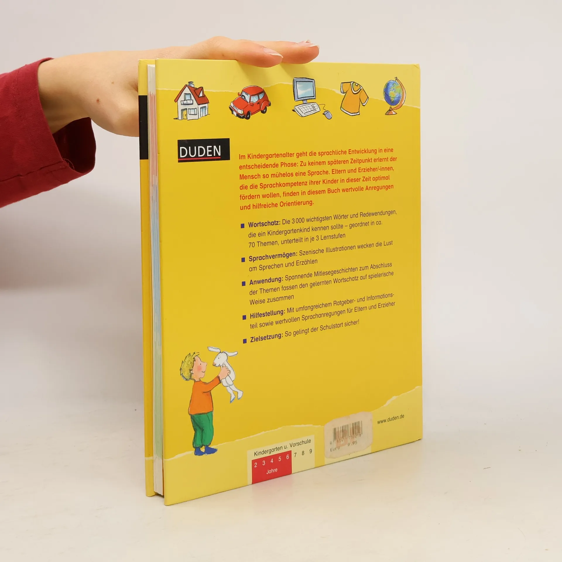 In dem aktualisierten Standardwerk von Duden finden Eltern und Erzieher die 3.000 wichtigsten Wörter und Redewendungen, die Kinder zum sicheren Schuleinstieg benötigen. Die Wörterlisten sind in ca. 70 Themen aus der Lebenswelt der Kinder geordnet und in je 3 Lernstufen unterteilt. Szenische Illustrationen wecken die Lust am Erzählen. Zum Abschluss des Themas wird der gelernte Wortschatz nochmals in einer Mitlese-Geschichte zusammengefasst. Mit Ratgeber- und Informationsteil sowie praktischen Checklisten für Eltern. So gelingt der Schulstart sicher!