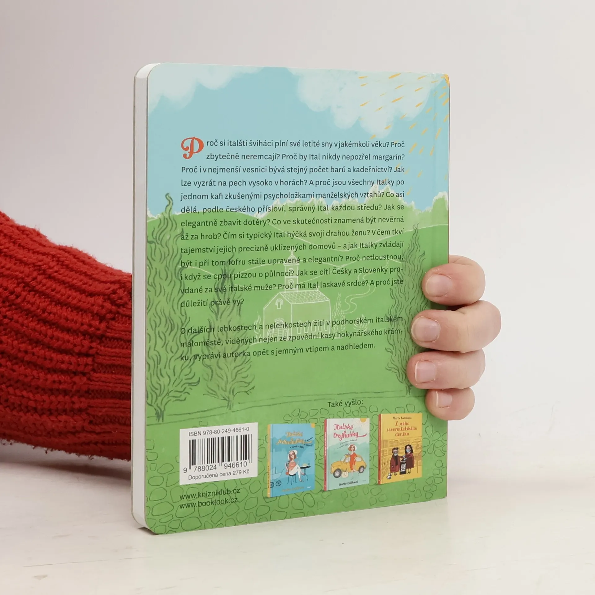 Proč si italští šviháci plní své letité sny v jakémkoli věku? Proč zbytečně neremcají? Proč by Ital nikdy nepozřel margarín? Proč i v nejmenší vesnici bývá stejný počet barů a kadeřnictví? Jak lze vyzrát na pech vysoko v horách? A proč jsou všechny Italky po jednom kafi zkušenými psycholožkami manželských vztahů? Co asi dělá, podle českého přísloví, správný Ital každou středu? Jak se elegantně zbavit dotěry? Co ve skutečnosti znamená být nevěrná až za hrob? Čím si typický Ital hýčká svoji drahou ženu? V čem tkví tajemství jejich precizně uklizených domovů – a jak Italky zvládají být i při tom fofru stále upravené a elegantní? Proč netloustnou, i když se cpou pizzou o půlnoci? Jak se cítí Češky a Slovenky provdané za své italské muže? Proč má Ital laskavé srdce? A proč jste důležití právě VY? O dalších lehkostech a nelehkostech žití v podhorském italském maloměstě, viděných nejen ze zpovědní kasy hokynářského krámku, vypráví autorka, žijící v těchto končinách téměř patnáct let, opět s jemným vtipem a nadhledem.