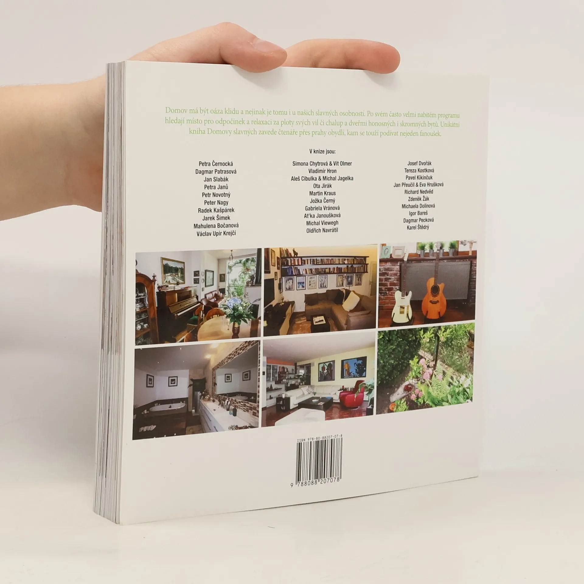 Exkluzivní fotografie a doprovodné komentáře zachycují kuchyně a obývací pokoje, jídelní stoly i pracovní kouty, ložnice a dokonce koupelny či toalety slavných. Výpravná publikace čtenářům přibližuje osobnosti české kultury v jejich nejpřirozenějším prostředí a zároveň je může inspirovat při tvorbě či úpravách domova vlastního.