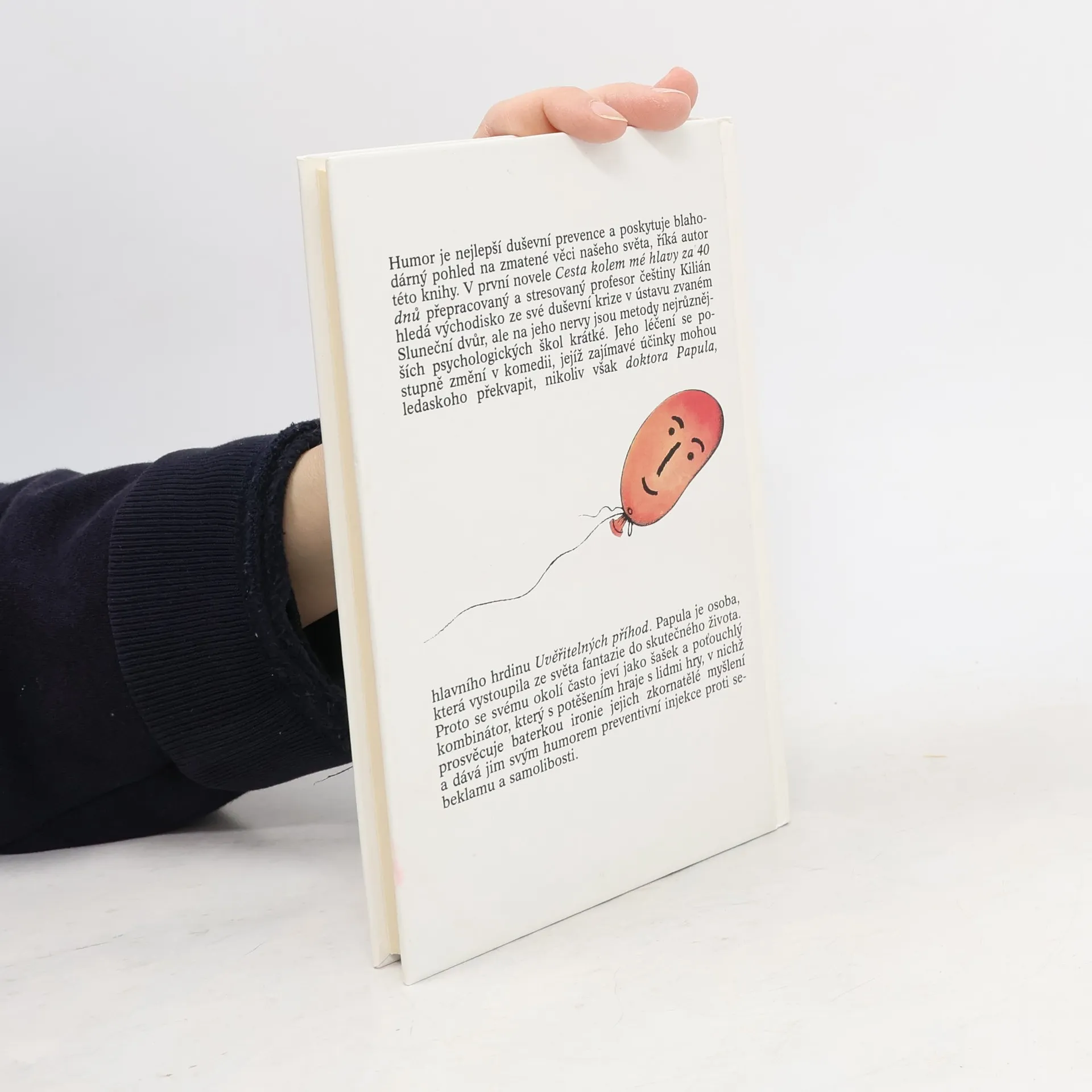 Humor je nejlepší duševní prevence a poskytuje blahodárný pohled na zmatené věci našeho světa, říká autor této knihy. V první novele Cesta kolem mé hlavy za 40 dnů přepracovaný a stresovaný profesor češtiny Kilián hledá východisko ze své duševní krize v ústavu zvaném Sluneční dvůr, ale na jeho nervy jsou metody nejrůznějších psychologických škol krátké.Jeho léčení se postupně změní v komedii, jejíž zajímavé účinky mohou ledaskoho překvapit, nikoliv však doktora Papula, hlavního hrdinu Uvěřitelných příhod. Papula je osoba, která vystoupila ze světa fantazie do skutečného života. Proto se svému okolí často jeví jako šašek a poťouchlý kombinátor, který s potěšením hraje s lidmi hry v nichž prosvěcuje baterkou ironie jejich z kornatělé myšlení a dává jim svým humorem preventivní injekce proti sebeklamu a samolibosti.... celý text