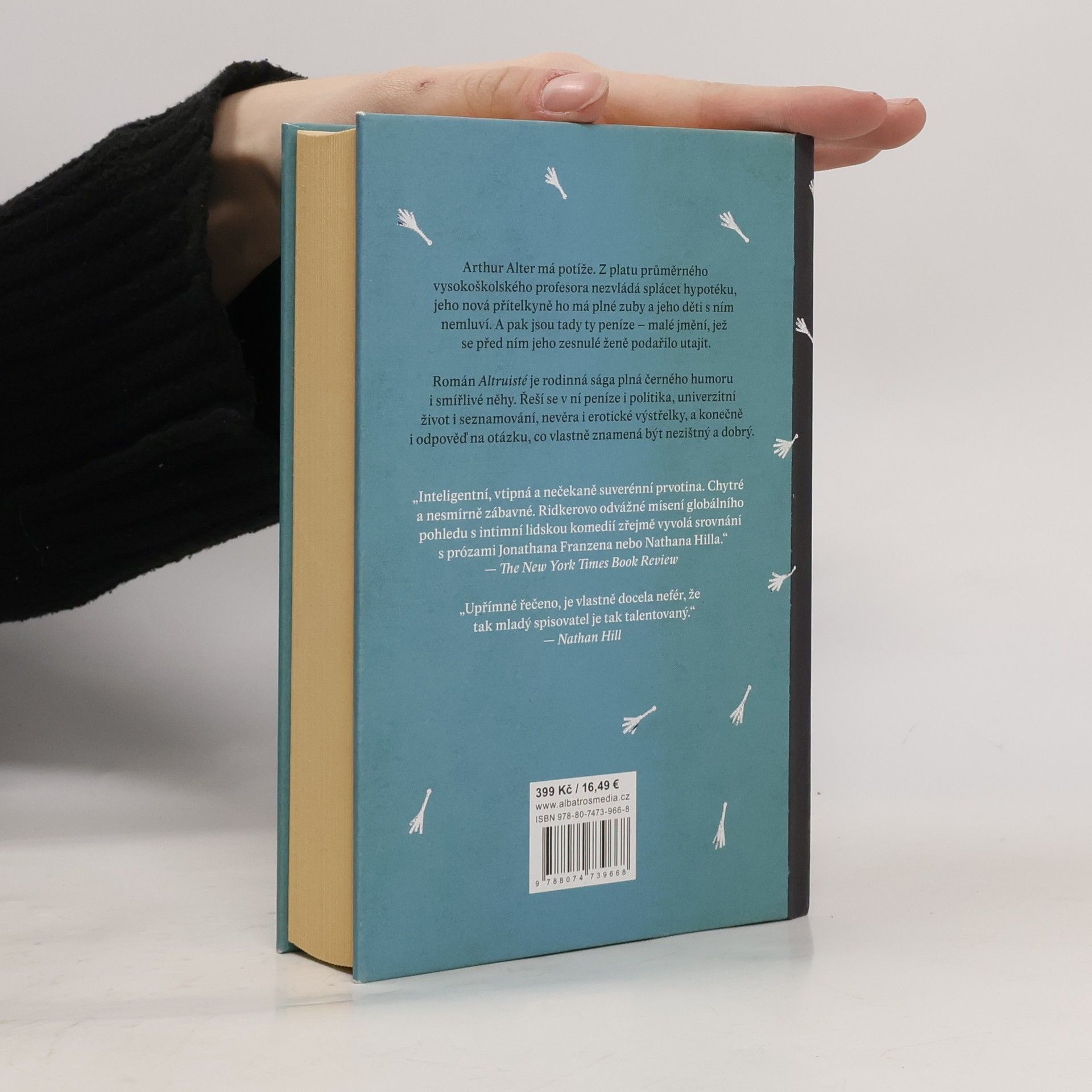 Začalo to altruismem, kdo ví, jak to skončí. Arthur Alter má potíže. Z platu průměrného vysokoškolského profesora nezvládá splácet hypotéku, jeho nová přítelkyně ho má plné zuby a jeho děti s ním nemluví. A pak jsou tu ještě ty peníze – malé jmění, jež se před ním jeho zesnulé ženě Francine podařilo utajit. A tenhle majetek Francine odkázala přímo jejich dětem: Ethanovi, věčně úzkostnému samotáři, který žije z matčiných peněz na jedné z nejžádanějších brooklynských adres, a Maggie, která se usilovně snaží páchat dobro a žít ušlechtilým životem v dobrovolně zvolené chudobě. Ve strachu ze ztráty rodinného sídla pozve Arthur pod záminkou smíření své děti domů do St. Louis. Netuší však, že tím otevřel Pandořinu skříňku dávných konfliktů a hluboko pohřbených vzpomínek. Román Altruisté je rodinná sága plná černého humoru i smířlivé něhy. Řeší se v ní peníze i politika, univerzitní život i seznamování, nevěra i erotické výstřelky, a konečně i odpověď na otázku, co vlastně znamená být „dobrým člověkem“