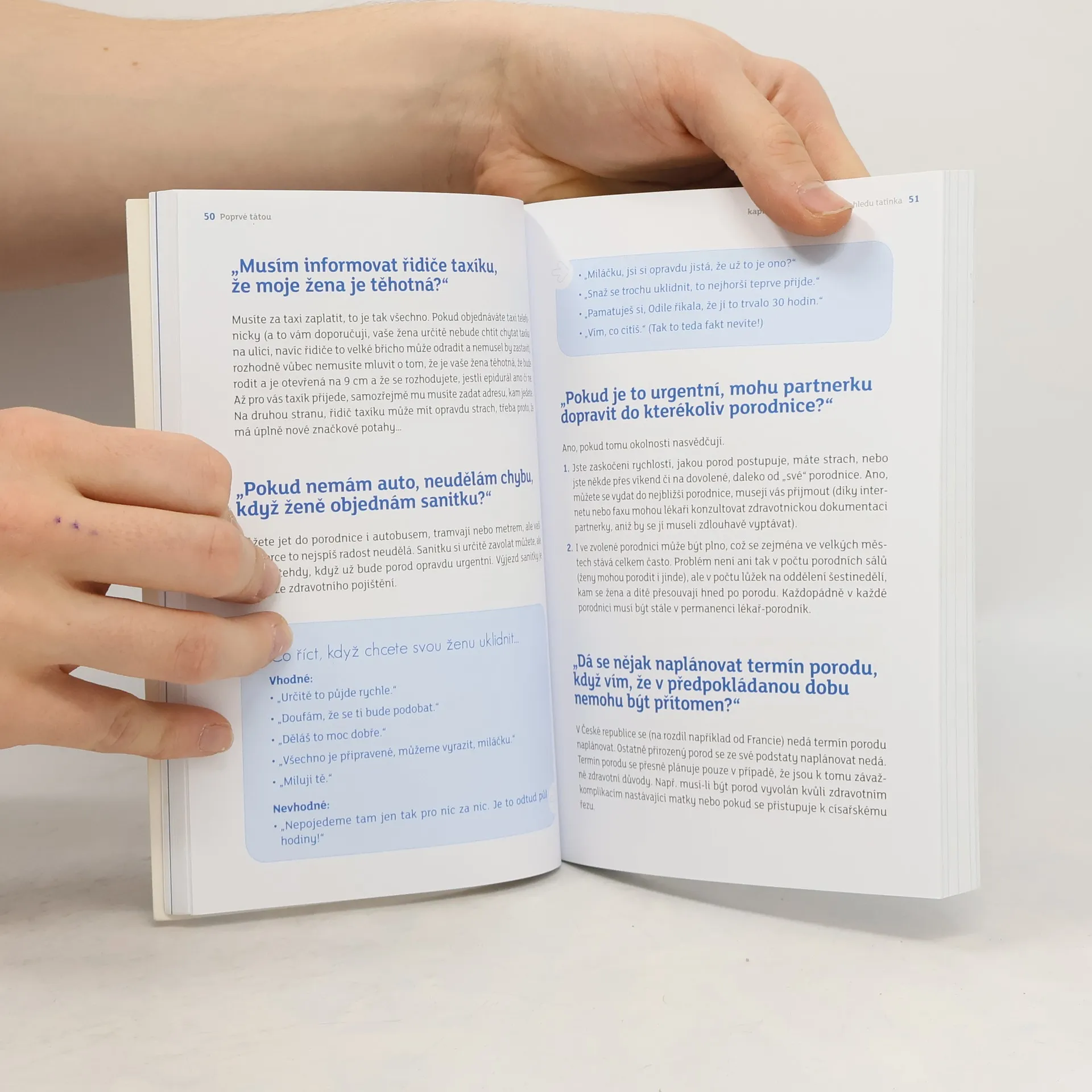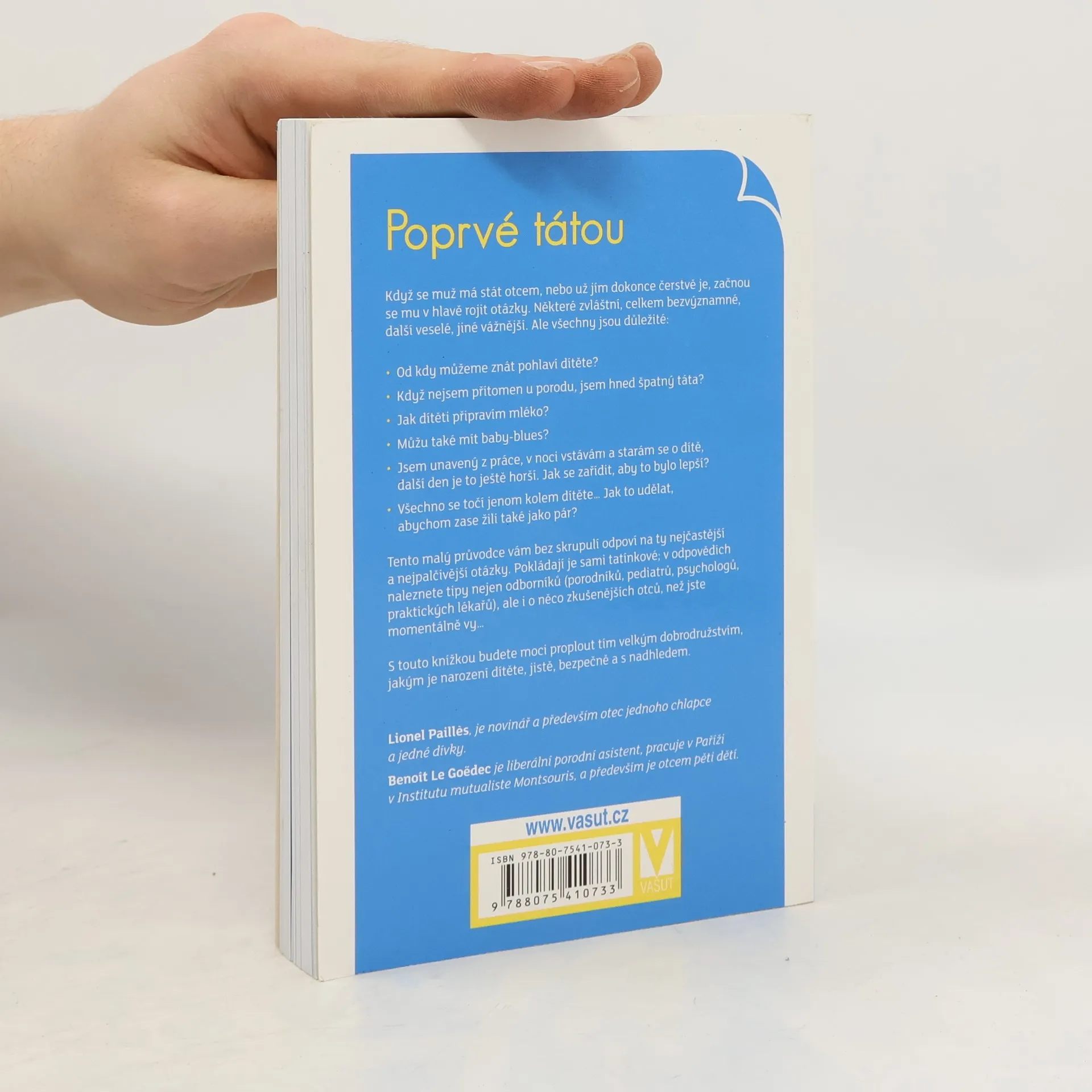 Když se muž má stát otcem, nebo už jím dokonce čerstvě je, začnou se mu v hlavě rojit otázky. Některé zvláštní, celkem bezvýznamné, další veselé, jiné vážnější. Ale všechny jsou důležité: • Od kdy můžeme znát pohlaví dítěte? • Když nejsem přítomen u porodu, jsem hned špatný táta? • Jak dítěti připravím mléko? • Můžu také mít baby-blues? • Jsem unavený z práce, v noci vstávám a starám se o dítě, další den je to ještě horší. Jak se zařídit, aby to bylo lepší? • Všechno se točí jenom kolem dítěte… Jak to udělat, abychom zase žili také jako pár? Tento malý průvodce vám bez skrupulí odpoví na ty nejčastější a nejpalčivější otázky. Pokládají je sami tatínkové; v odpovědích naleznete tipy nejen odborníků (porodníků, pediatrů, psychologů, praktických lékařů), ale i o něco zkušenějších otců, než jste momentálně vy… S touto knížkou budete moci proplout tím velkým dobrodružstvím, jakým je narození dítěte, jistě, bezpečně a s nadhledem.