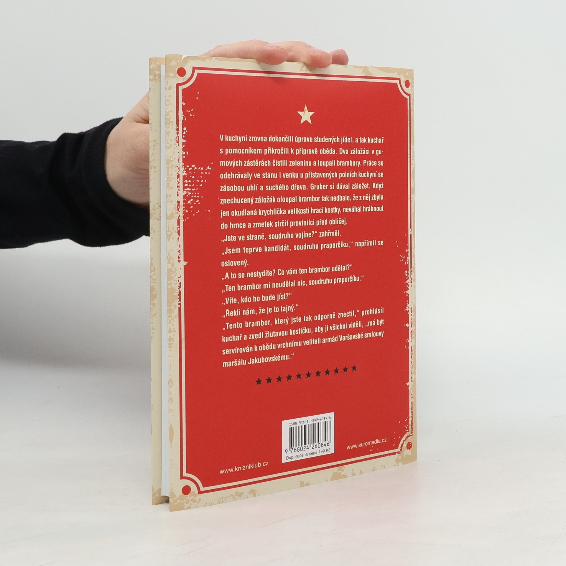 Je začátek normalizace. 51. vojenský prapor potrubní dopravy provedl povinné čistky, mezi suspendovanými je i prostořeký štábní lékař Josef a prvotřídní kuchař útvaru Hans. Navzdory politické nespolehlivosti jsou nečekaně povoláni do akce. V bohem zapomenutém újezdu Krupice bude probíhat cvičení československých a sovětských vojsk za účasti nejvyšších velitelů a kuchař s lékařem dostanou úkol: Josef má zaručit nezávadnost stravy coby ochutnávač, kdežto šéfkuchař musí osvědčit zkušenosti z přepychových hotelů. Oba vědí, že pokud se před papaláši něco pokazí, schytají to oni. A to náš mladý doktor nenápadně zatajil nákazu infekční žloutenkou. Sovětský maršál s hepatitidou B by pro oba znamenal kriminál… Nezaměnitelně ironické vyprávění autora básnické hexalogie se vrací do těžké doby, opět viděné prizmatem „veselé vědy o smutných věcech“.