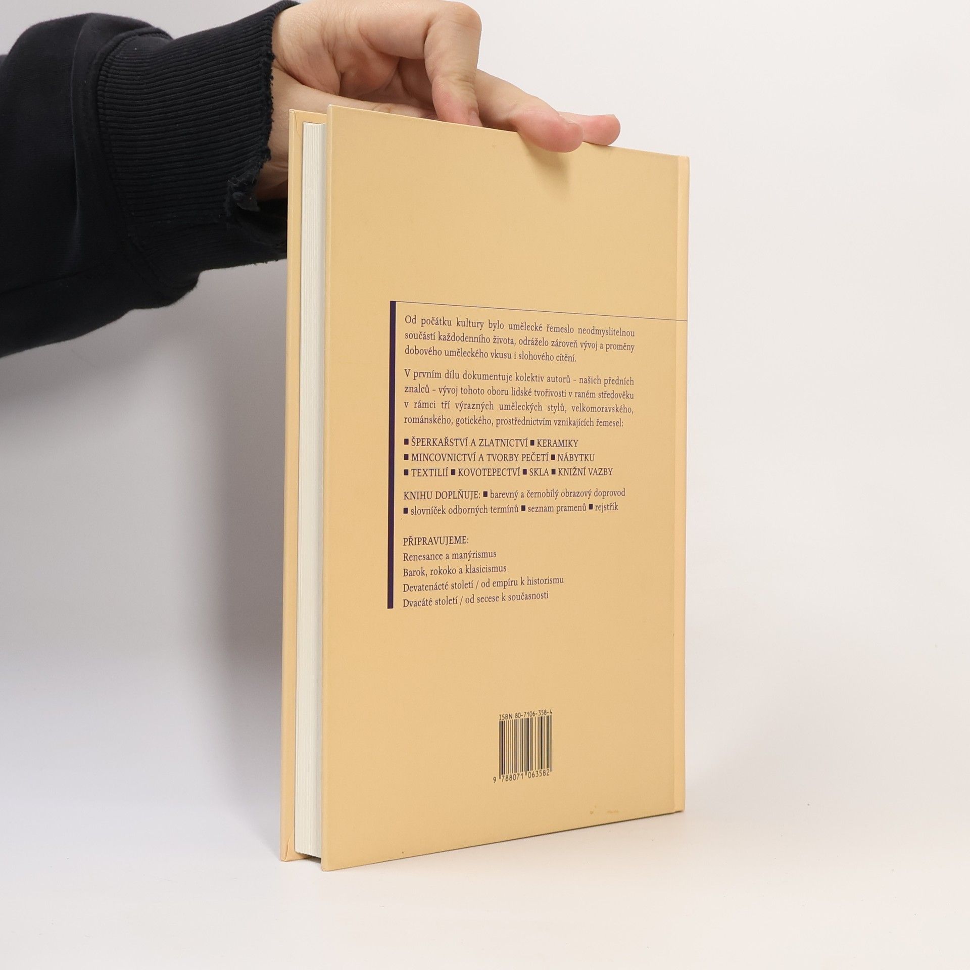 První díl monumentálního díla je věnován nejstarším dějinám uměleckých řemesel a užitého umění od dob Velké Moravy až po období gotiky, a to v jednotlivých podkapitolách, věnovaných šperkům a zlatnictví vůbec, keramice, mincím a pečetím, nábytku, textiliím, předmětům z kovu (bronz, železo, cín) a skla, hodinám a knižní vazbě.... celý text