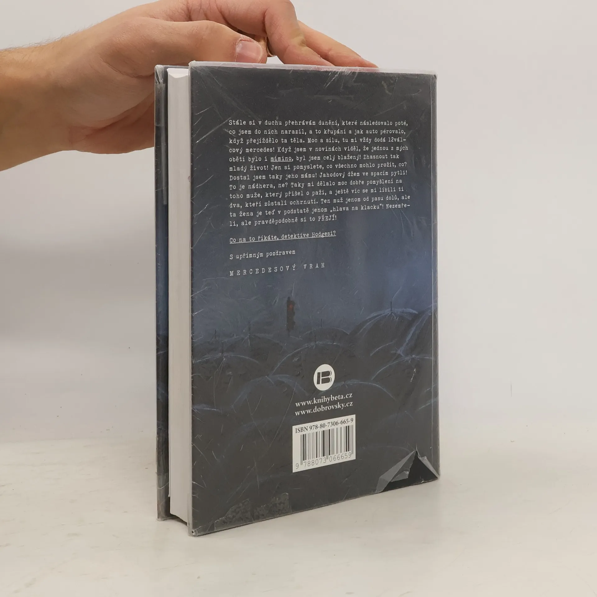 V nuzném městečku na americkém středozápadě dojde k neštěstí – neznámý řidič v ukradeném mercedesu úmyslně vjede do fronty nezaměstnaných před pracovní agenturou a na místě zůstane osm mrtvých a patnáct zraněných. Řidič z místa činu ujede. Po několika měsících dostane vysloužilý zatrpklý policista ze stejného městečka podivný dopis od kohosi, kdo se k činu přihlásí a zároveň oznámí, že chystá mnohem strašlivější útok – plánuje zmasakrovat tisíce lidí. Policistu to probudí z letargie a nastane závod s časem, aby zločinci ve vražedném útoku zabránil. Detektivní příběh ve stylu drsné školy z pera mistra napětí umožní čtenářům děsivým a nezapomenutelným způsobem nahlédnout do mysli šíleného posedlého vraha. Příběh byl inspirován skutečnou událostí a jeho závěr, což je mnohem mrazivější, skutečnou událost naopak předjímal.