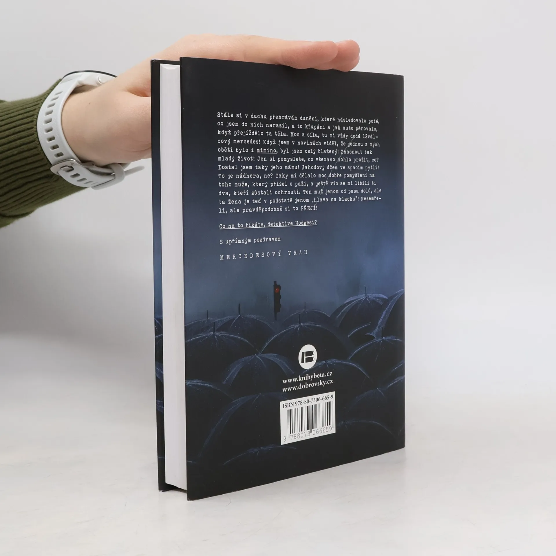 V nuzném městečku na americkém středozápadě dojde k neštěstí – neznámý řidič v ukradeném mercedesu úmyslně vjede do fronty nezaměstnaných před pracovní agenturou a na místě zůstane osm mrtvých a patnáct zraněných. Řidič z místa činu ujede. Po několika měsících dostane vysloužilý zatrpklý policista ze stejného městečka podivný dopis od kohosi, kdo se k činu přihlásí a zároveň oznámí, že chystá mnohem strašlivější útok – plánuje zmasakrovat tisíce lidí. Policistu to probudí z letargie a nastane závod s časem, aby zločinci ve vražedném útoku zabránil. Detektivní příběh ve stylu drsné školy z pera mistra napětí umožní čtenářům děsivým a nezapomenutelným způsobem nahlédnout do mysli šíleného posedlého vraha. Příběh byl inspirován skutečnou událostí a jeho závěr, což je mnohem mrazivější, skutečnou událost naopak předjímal.