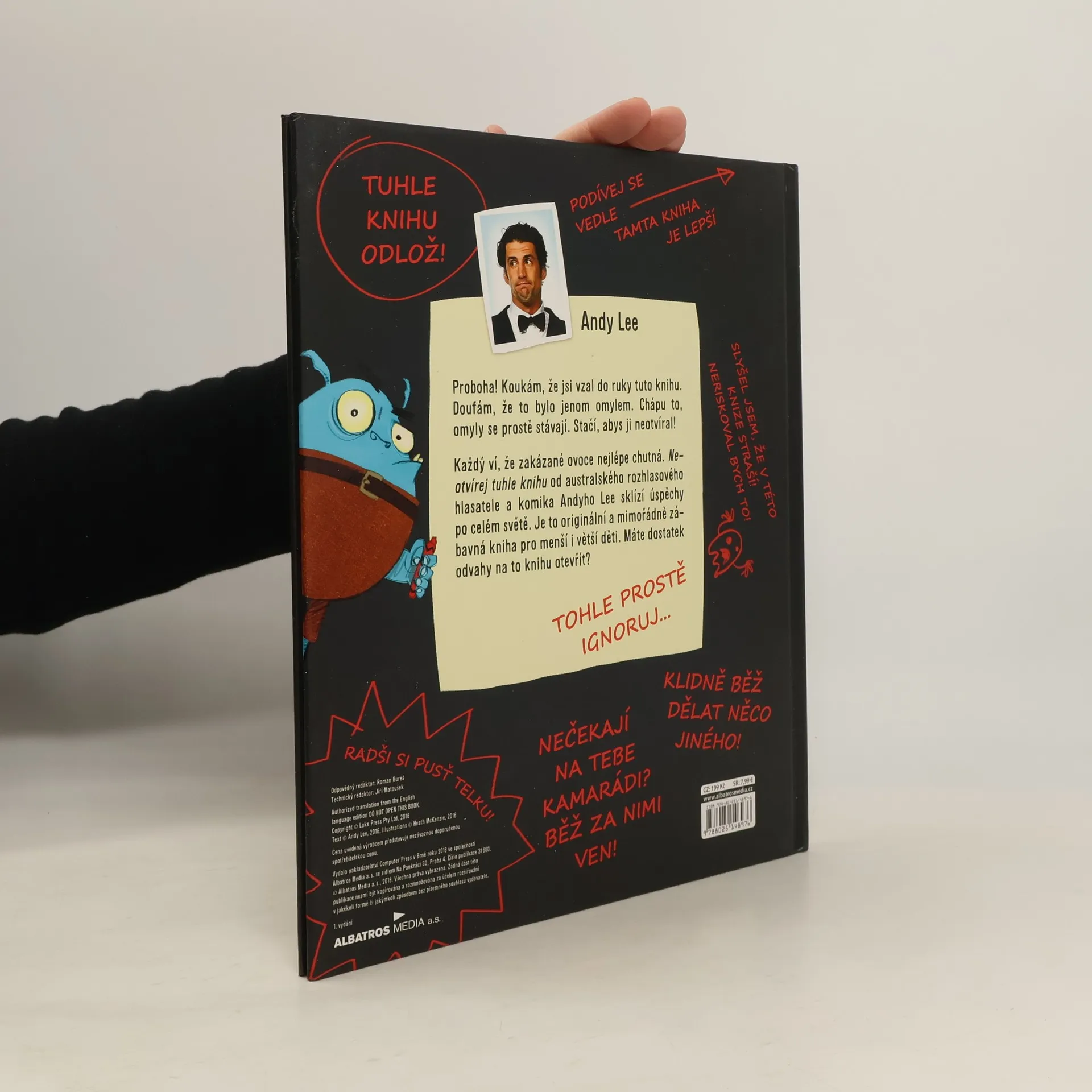 Proboha! Koukám, že jsi vzal do ruky tuto knihu. Doufám, že to bylo jenom omylem. Chápu to, omyly se prostě stávají. Stačí, abys ji neotvíral! A co se stane, když ji náhodou otevřeš? Každý ví, že zakázané ovoce nejlépe chutná. Neotvírej tuhle knihu od australského rozhlasového hlasatele a komika Andyho Lee sklízí úspěchy po celém světě. Je to originální a mimořádně zábavná kniha pro menší i větší děti. Máte dostatek odvahy na to knihu otevřít?