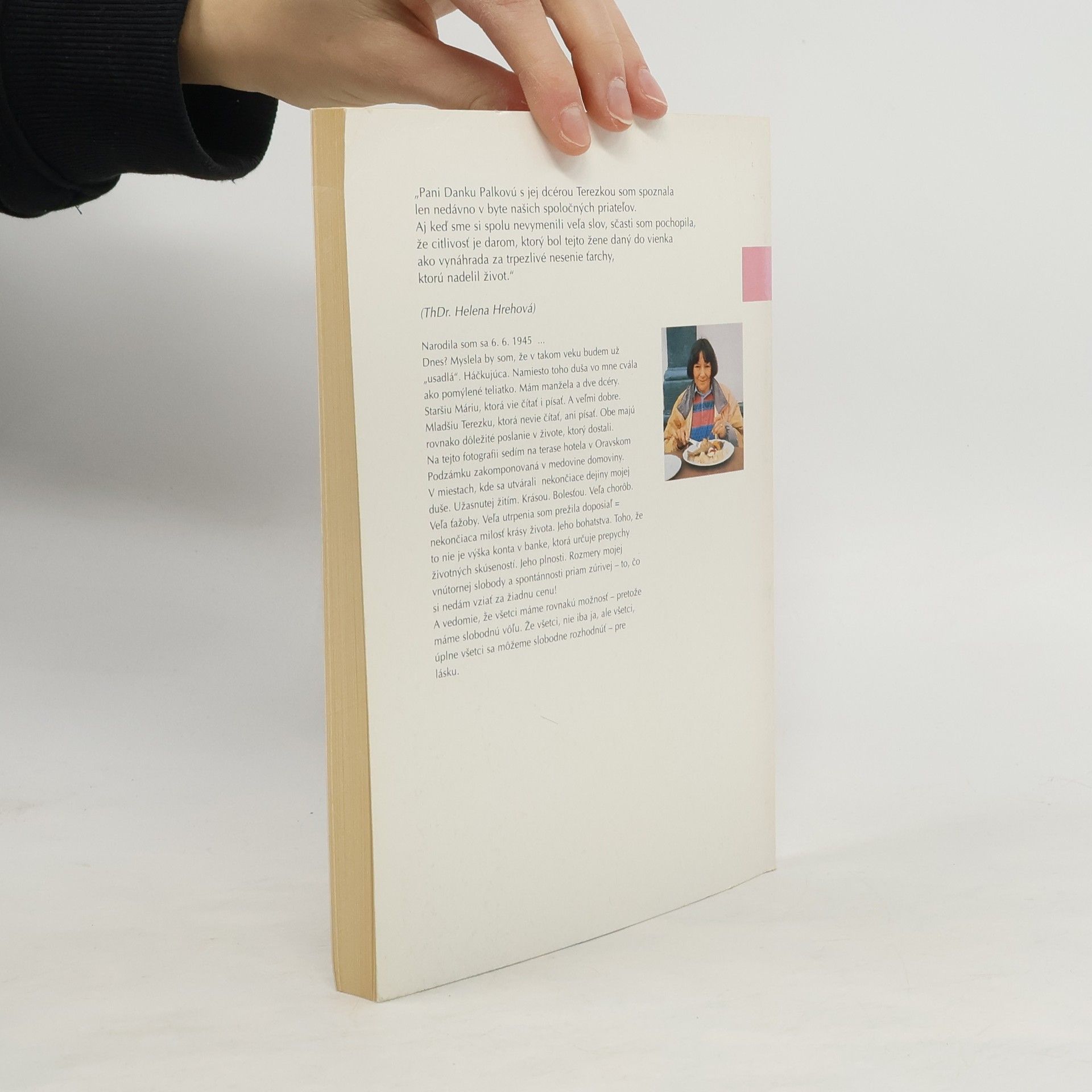 „Pani Danku Palkovú s jej dcérou Terezkou som spoznala len nedávno v byte našich spoločných priateľov. Aj keď sme si spolu nevymenili veľa slov, sčasti som pochopil že citlivosť je darom, ktorý bol tejto žene daný do vienka ako vynáhrada za trpezlivé nesenie ťarchy, ktorú nadelil život. " (ThDr. Helena Hrehová) Narodila som sa 6. 6. 1945... Dnes? Myslela by som, že v takom veku budem už „usadlá". Háčkujúca. Namiesto toho duša vo mne cvála ako pomýlené teliatko. Mám manžela a dve dcéry. Staršiu Máriu, ktorá vie čítať i písať. A veľmi dobre. Mladšiu Terezku, ktorá nevie čítať, ani písať. Obe majú rovnako dôležité poslanie v živote, ktorý dostali. Na tejto fotografii sedím na terase hotela v Oravskom Podzámku zakomponovaná v medovine domoviny. V miestach, kde sa utvárali nekončiace dejiny mojej duše. Užasnutej žitím. Krásou. Bolesťou. Veľa chorôb. Veľa ťažoby. Veľa utrpenia som prežila doposiaľ = nekončiaca milosť krásy života. Jeho bohatstva. Toho, že to nie je výška konta v banke, ktorá určuje prepychy životných skúseností. Jeho plnosti. Rozmery mojej vnútornej slobody a spontánnosti priam zúrivej - to, čo si nedám vziať za žiadnu cenu! A vedomie, že všetci máme rovnakú možnosť - pretože máme slobodnú vôľu. Že všetci, nie iba ja, ale všetci, úplne všetci sa môžeme slobodne rozhodnúť - pre lásku.