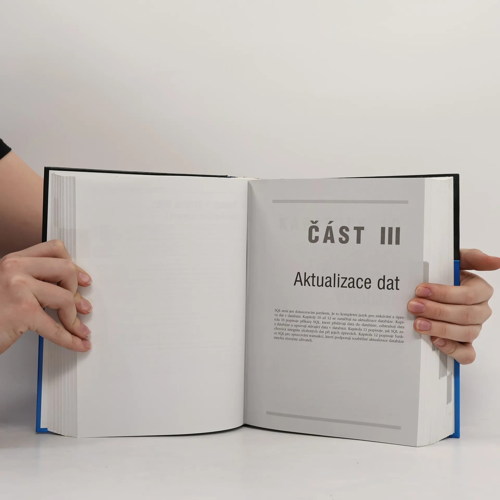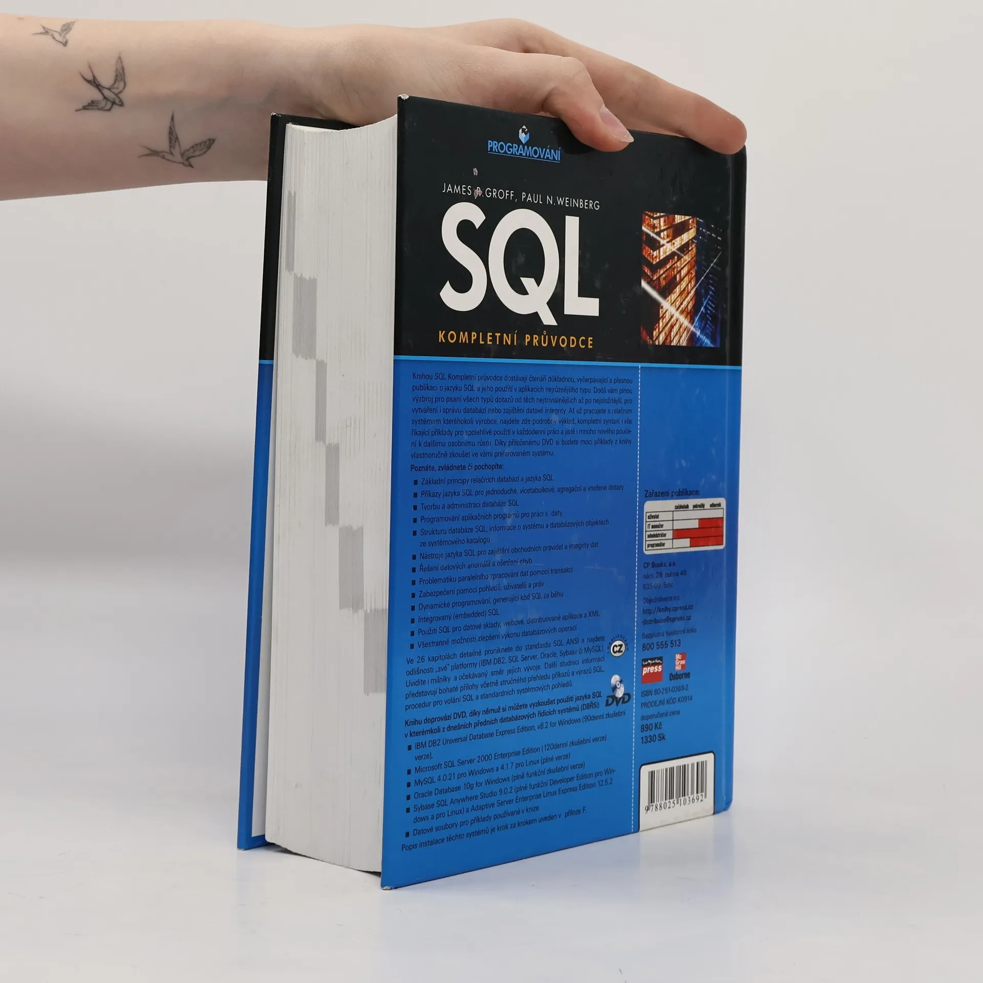 Podrobný popis příkazů a možností jazyka SQL, datová integrita, systémový katalog, zabezpečení, výklad, syntaxe, příklady, praktické uplatnění, popisuje standart SQL i odlišnosti platforem, přístup z aplikací, datové sklady, webové servery.