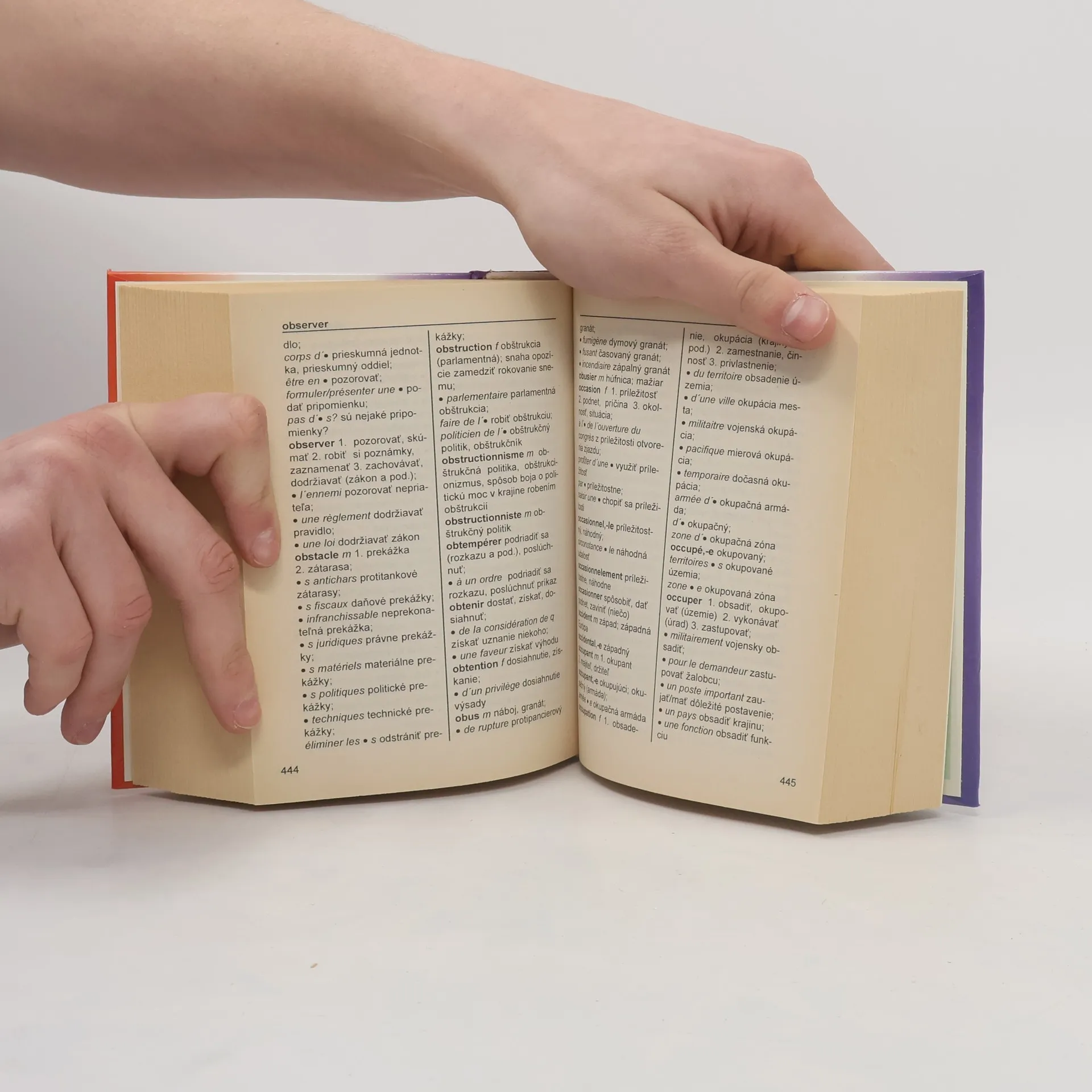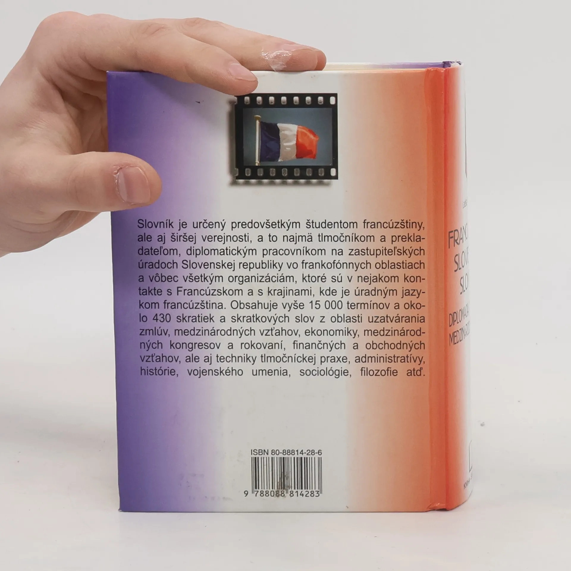 Predkladaný slovník je prvé dielo svojho druhu vydané na Slovensku. Spracovaný je na základe rozsiahlych excerpcií z najnovších francúzskych materiálov. Tento ojedinelý slovník obsahuje viac ako 15 000 veľmi precízne rozpracovaných hesiel a okolo 430 skratiek a skratkových slov. Obsahuje termíny a terminologické spojenia z oblasti uzatvárania zmlúv, medzinárodných vzťahov, ekonomiky, medzinárodných kongresov a rokovaní, finančných a obchodných vzťahov, ale aj techniky tlmočníckej praxe, administratívy, histórie, vojenského umenia, sociológie, filozofie atď. V diele sa vyskytujú aj neologizmy, ktoré sa v doteraz existujúcich lexikografických dielach neobjavili. Slovník je určený tlmočníkom, prekladateľom, študentom, diplomatom a vôbec všetkým organizáciám, ktoré sú v kontakte s frankofónnymi oblasťami.