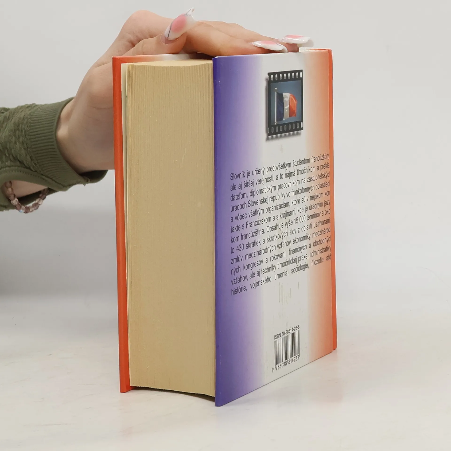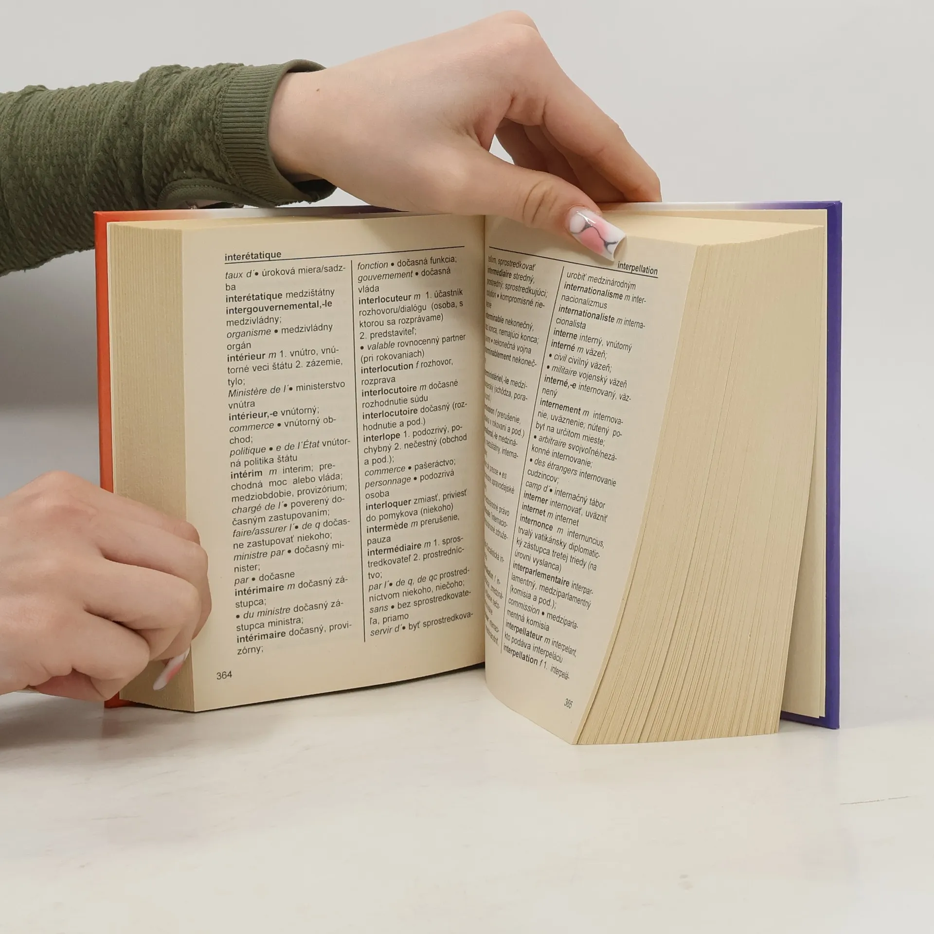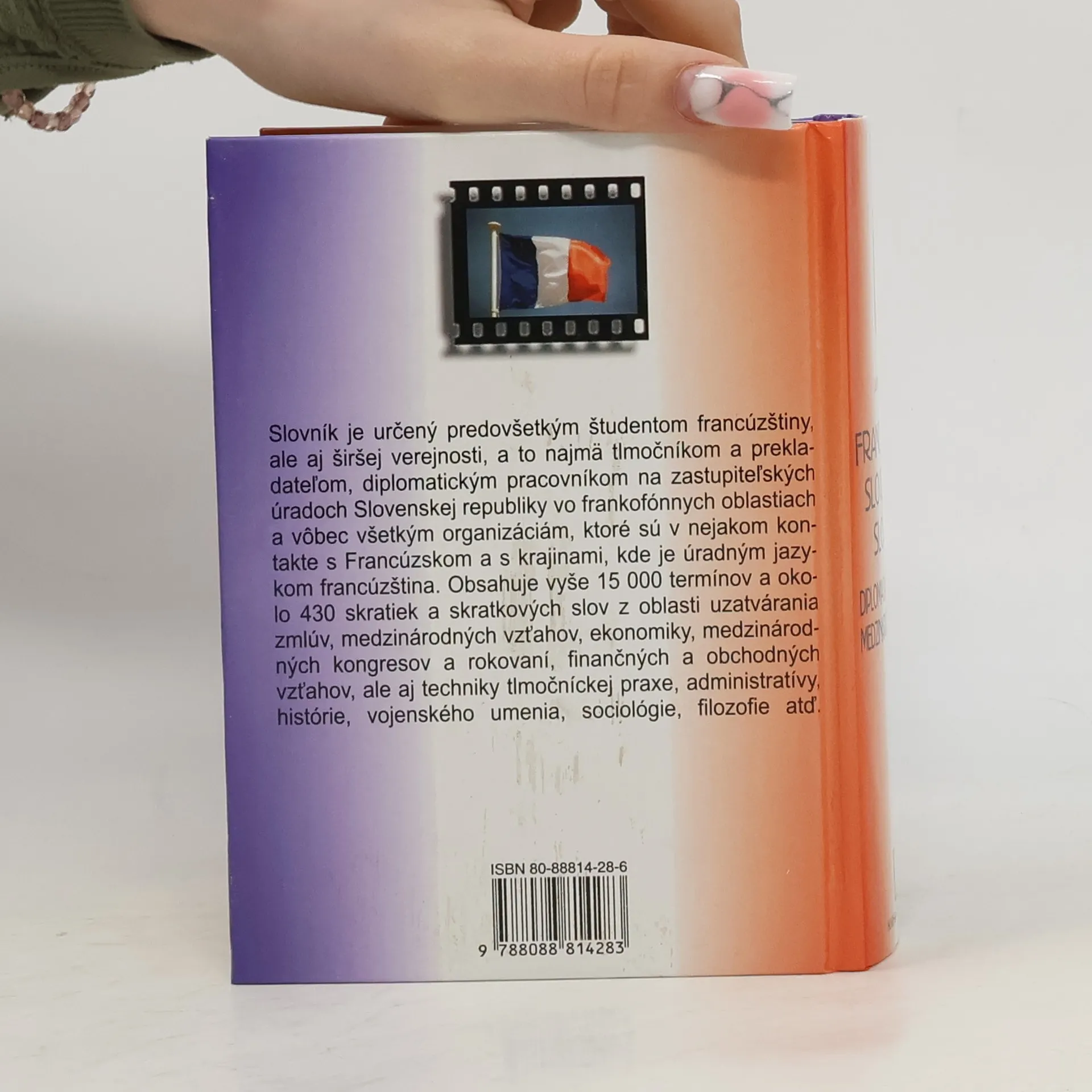 Predkladaný slovník je prvé dielo svojho druhu vydané na Slovensku. Spracovaný je na základe rozsiahlych excerpcií z najnovších francúzskych materiálov. Tento ojedinelý slovník obsahuje viac ako 15 000 veľmi precízne rozpracovaných hesiel a okolo 430 skratiek a skratkových slov. Obsahuje termíny a terminologické spojenia z oblasti uzatvárania zmlúv, medzinárodných vzťahov, ekonomiky, medzinárodných kongresov a rokovaní, finančných a obchodných vzťahov, ale aj techniky tlmočníckej praxe, administratívy, histórie, vojenského umenia, sociológie, filozofie atď. V diele sa vyskytujú aj neologizmy, ktoré sa v doteraz existujúcich lexikografických dielach neobjavili. Slovník je určený tlmočníkom, prekladateľom, študentom, diplomatom a vôbec všetkým organizáciám, ktoré sú v kontakte s frankofónnymi oblasťami.
