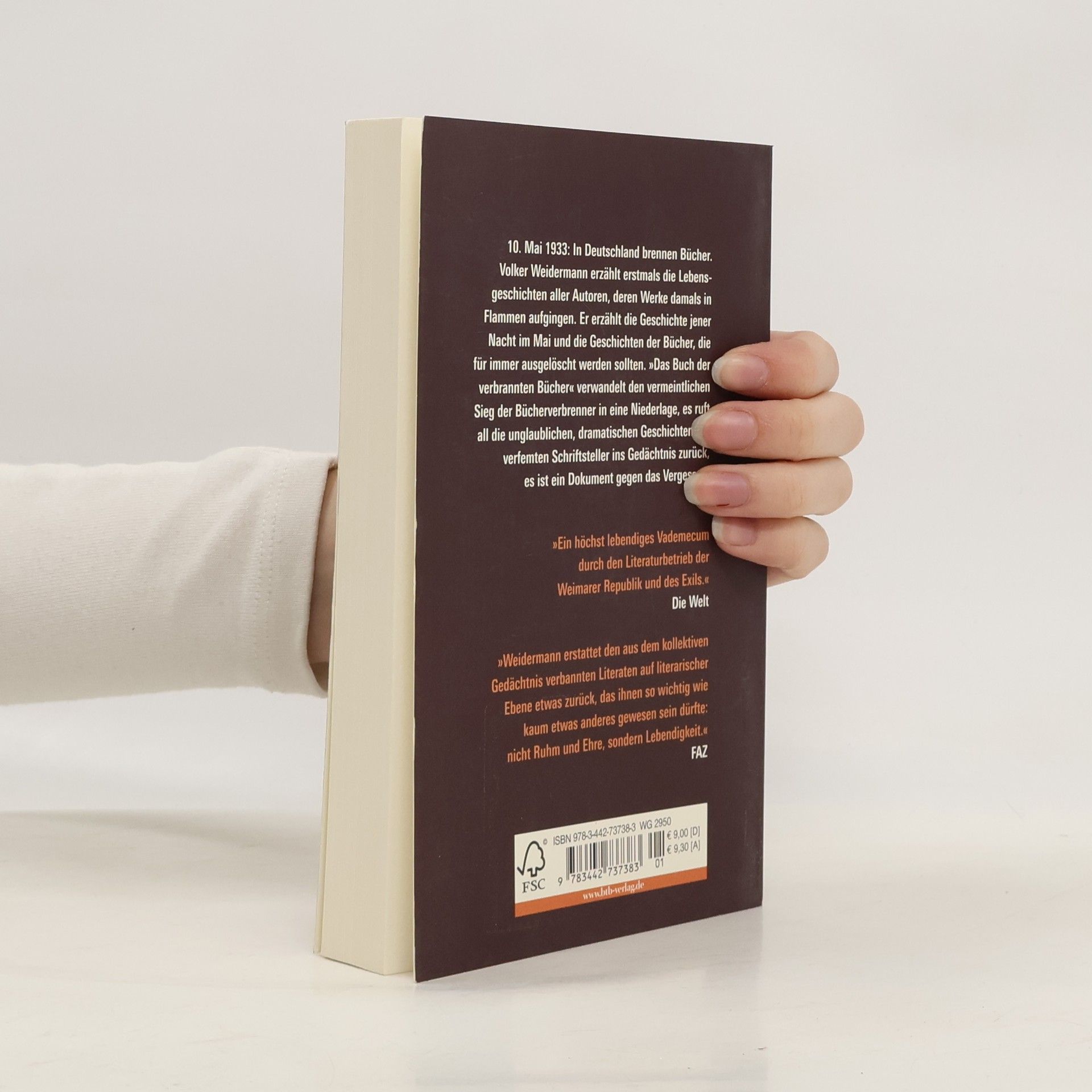 Die Bücherverbrennung am 10. Mai 1933: Wie es dazu kam, welche Bücher verbrannt wurden und was mit den Autoren geschah Nach dem überwältigenden Erfolg von Lichtjahre, seiner kurzen Geschichte der deutschen Literatur nach 1945, wendet Volker Weidermann den Blick zurück auf den Tag, an dem in Deutschland die Bücher brannten. Seine Mission: diese Bücher, diese Autoren dem Vergessen entreißen! Es wurde angekündigt als »Aktion wider den undeutschen Geist«: Die akribische landesweite Vorbereitung gipfelte am 10. Mai 1933 in der Errichtung von Scheiterhaufen in vielen deutschen Städten, auf die dann Studenten, Bibliothekare, Professoren und SA-Leute in einer gespenstischen Feierstunde die Bücher warfen, die nicht mit ihrer menschenverachtenden Ideologie vereinbar waren. Unvergessen die Tonbandmitschnitte, die dokumentieren, wie Joseph Goebbels auf dem Platz neben der Berliner Staatsoper mit den Worten »Und wir übergeben den Flammen die Werke von …« die einzelnen Autoren aufrief, von denen einige sogar anwesend waren. Volker Weidermann erzählt, wie dieser Tag verlief, an dem es trotzig regnete, er erzählt von dem Bibliothekar Herrmann, der die Urliste aller Listen erstellte, nach denen dann die Scheiterhaufen bedient wurden, und er erzählt von den Werken und ihren Autoren – und davon, wie willfährige Buchhändler und Bibliothekare die Bücher aus ihren Regalen entfernten, so gründlich, dass viele Werke und Autoren danach nicht wieder zum Vorschein kamen. Das Ergebnis sind über 100 Lebens- und Werkgeschichten von Schriftstellern, darunter neben Klassikern wie Kästner, Tucholsky, Zweig, Brecht und Remarque auch völlig vergessene wie Rudolf Braune, ausländische Autoren wie Ernest Hemingway, und sehr viele, wie z.B. Hermann Essig, die unbedingt wiedergelesen werden sollten. Ein Buch über Bücher, Schicksale und ein Land, in dem zuerst Bücher verbrannt wurden und dann Menschen.