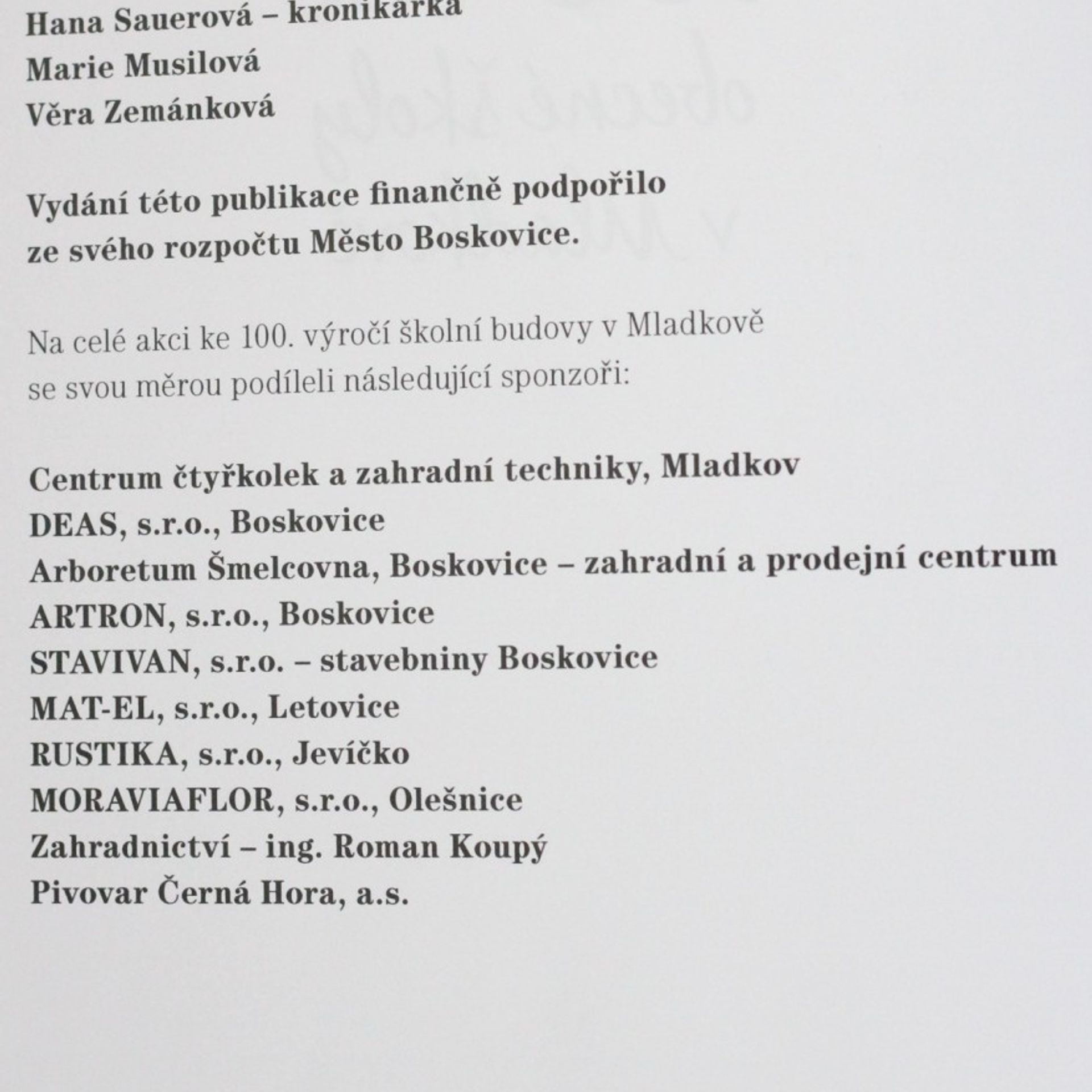 Významné výročí v historii obce Mladkov (dnes součásti Boskovic) podnítilo vznik publikace, ve které se kromě jubilea školy připomíná také činnost hasičského sboru, Sokola, stručně také v minulosti bohaté činnosti (kdo dnes např. ví, že právě v Mladkově vyhrál svůj první závod žokej Josef Váňa?) a důležitost významných budov v obci. Cenná je zejména bohatá obrazová dokumentace, která informativní text knihy doplňuje.