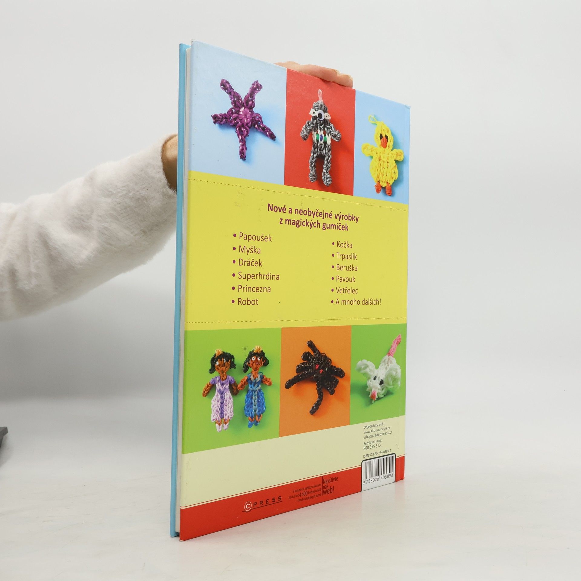 Zvířátka a mýtická stvoření. Holky i kluci gumičky prostě milují! Nosit náramek z barevných gumiček je velká móda. Ovšem nyní můžeš uplést daleko více! Přinášíme 25 zcela nových a neobyčejných nápadů, díky kterým si užiješ zábavu a ještě se blýskneš před kamarády. Srozumitelné návody doprovázené názornými fotografiemi ti umožní vyrobit roztomilá zvířátka a fantastické postavičky, které využiješ třeba jako přívěsky na šperky či batoh nebo jako dárky a talismany. • Papoušek • Kočka • Myška • Trpaslík • Dráček • Beruška • Superhrdina • Pavouk • Princezna • Vetřelec • Robot • A mnoho dalších!