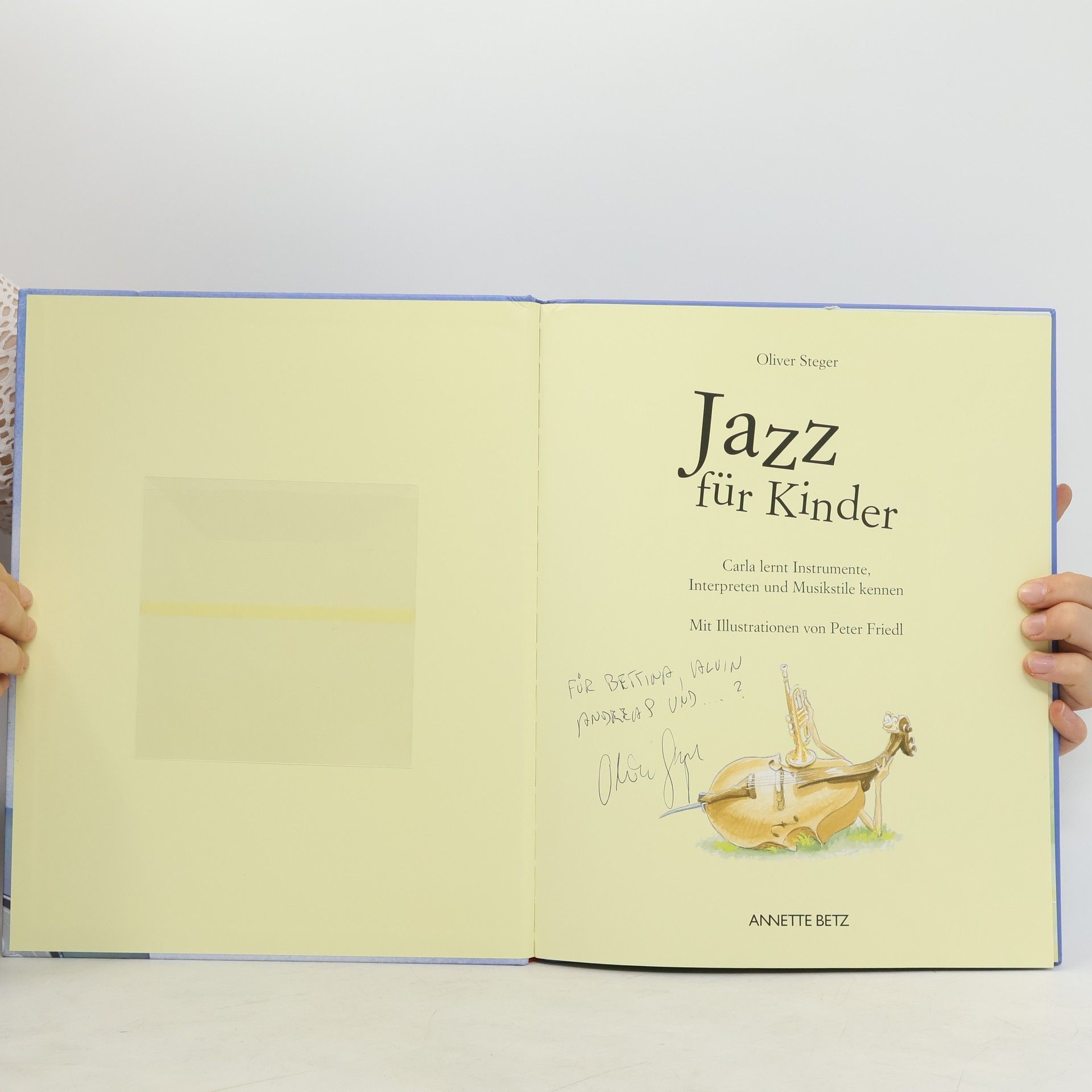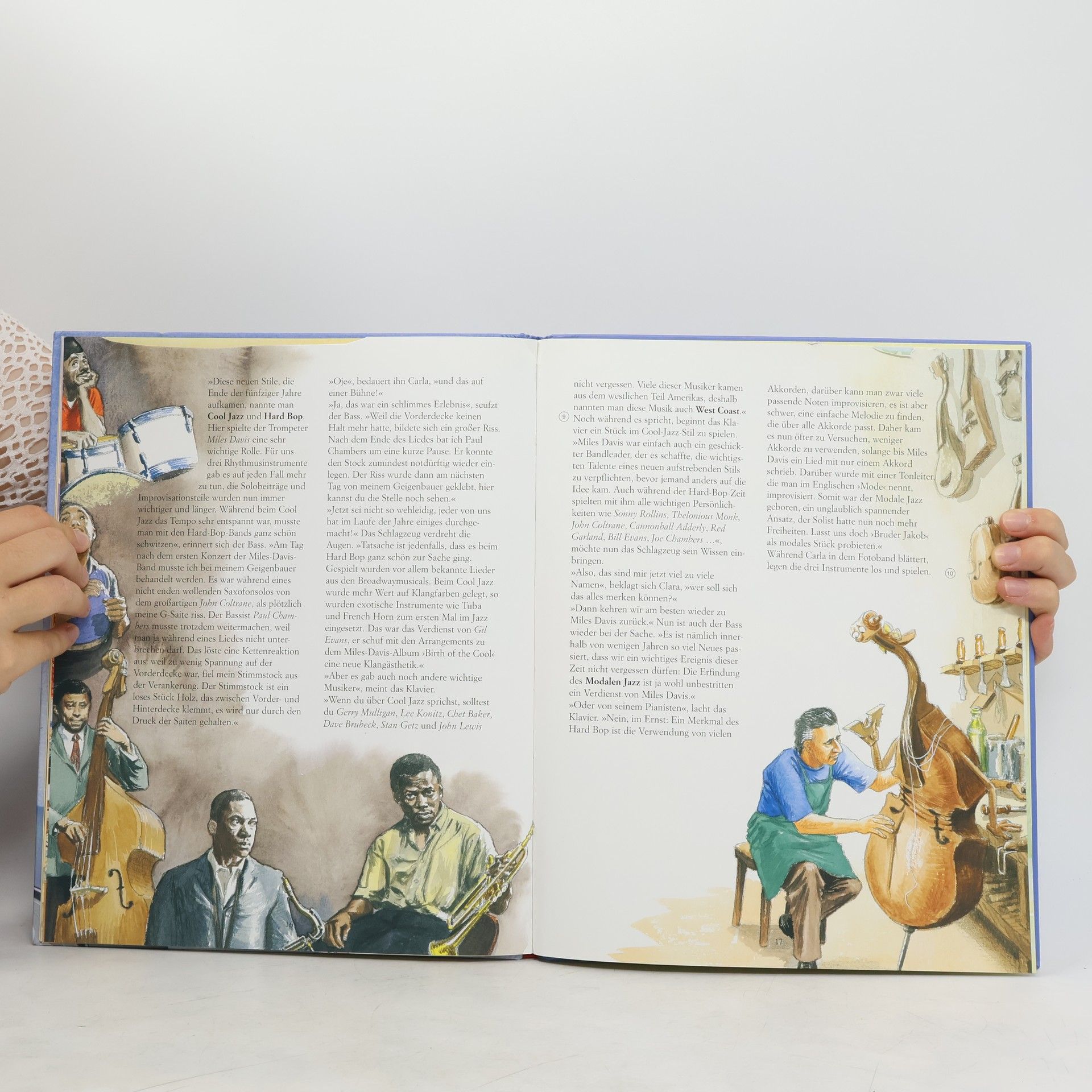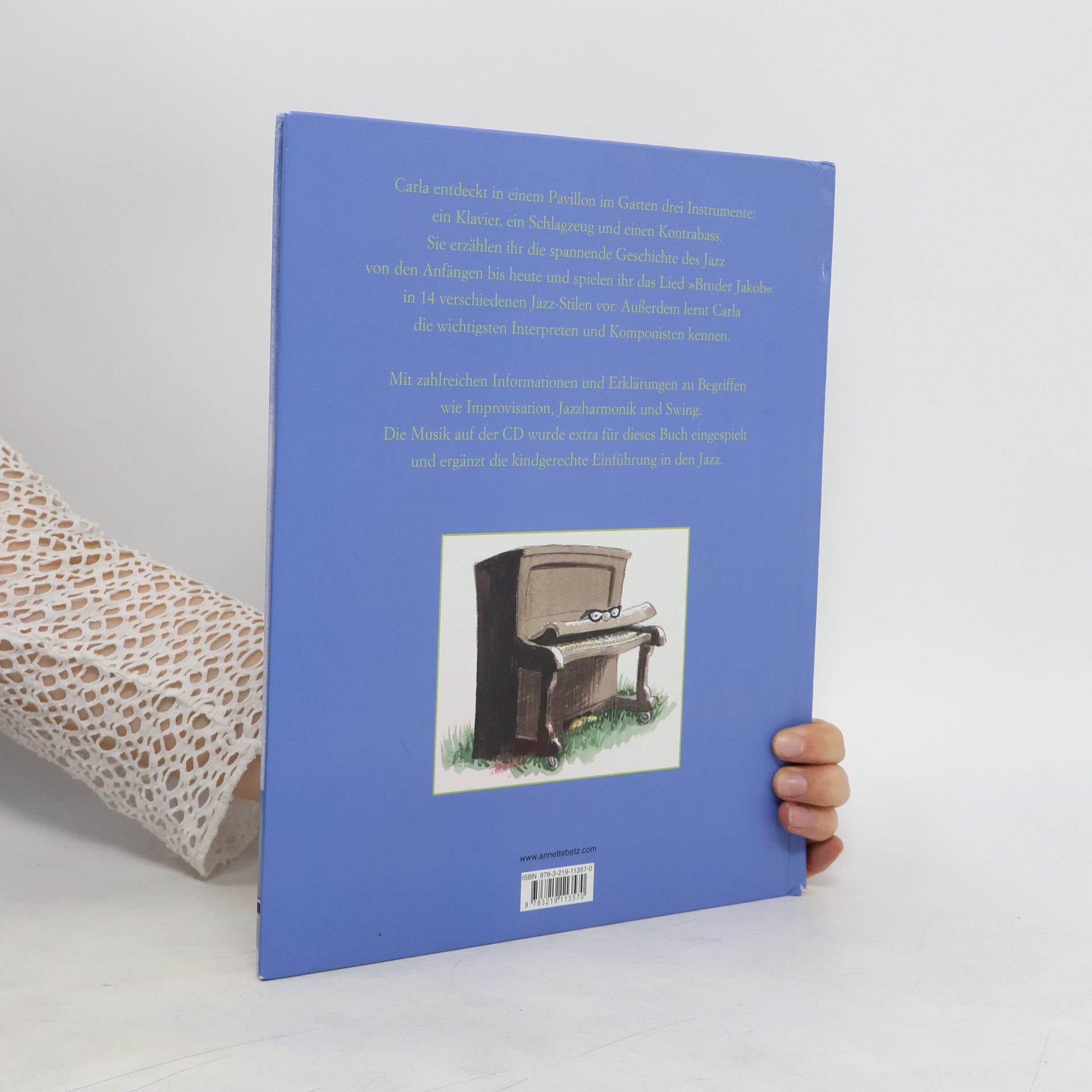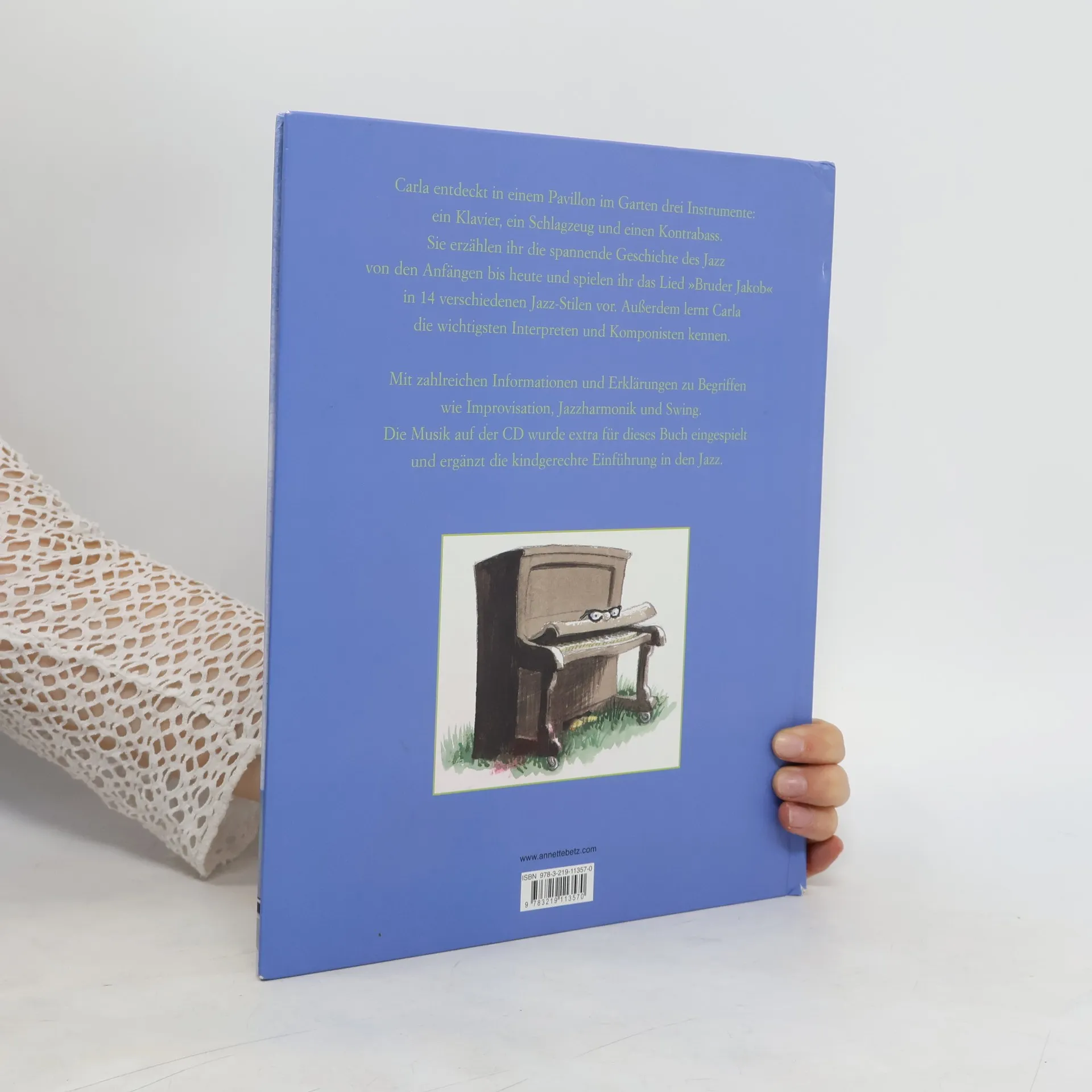 Was ist Jazz? In einem alten Gartenpavillon findet Carla ein Klavier, ein Schlagzeug und einen Kontrabass. Die Instrumente erzählen ihr über die Anfänge und Weiterentwicklung des Jazz. Carla erfährt, was Jazz ist, woher er kommt und was für Stilrichtungen entstanden sind. Begriffe wie Harmonien, Improvisation, solistisch oder Big-Band werden erklärt. Die Reise führt über die verschiedenen Jazzstile, die sich im Laufe der Zeit durch bekannte Musiker und Interpreten gebildet haben. Bekannte Namen wie Miles Davis, Duke Ellington oder Ella Fritzgerald werden im Zusammenhang mit bestimmten Strömungen wie Bebop, Ragtime, Freejazz u.s.w. genannt. Eine sehr gelungene CD führt durch all diese Jazzbewegungen und verdeutlicht anhand des Liedes "Bruder Jakob" in 14 Variationen, was mit den diversen Stilen gemeint ist. Auch mit den grossen Farbaquarellen bleibt das Thema und die vielen englischen Namen/Begriffe kompliziert und scheint mir für kleine Kinder nicht geeignet. Die Geschichte drumherum wirkt etwas konstruiert. Alles in allem trotzdem ein interessantes Buch mit tollen Musikbespielen! Ab 8 Jahren, ****, Denise Racine.