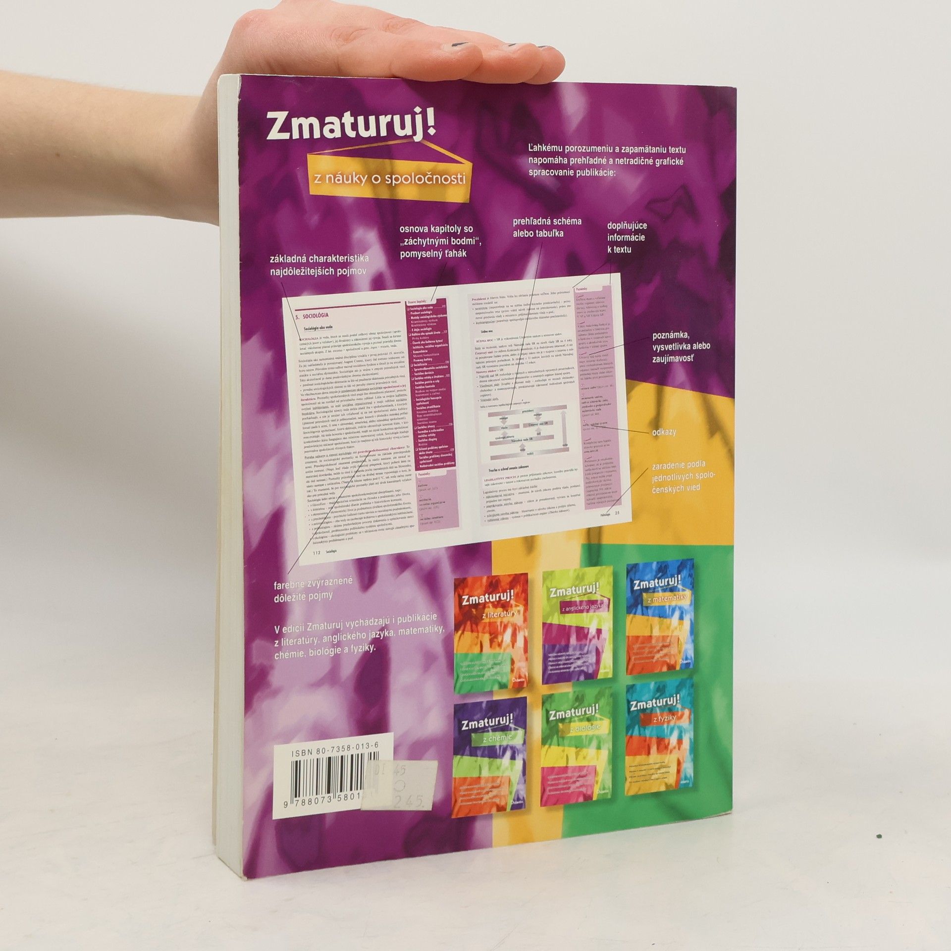 Sprievodca stredoškolským učivom náuky o spoločnosti predkladá v desiatich kapitolách základy spoločenských vied – politológie, ekonómie, filozofie, práva, medzinárodných vzťahov, sociológie, psychológie, etiky, logiky, teórie vedy a náboženstiev (najväčší priestor je venovaný prvým trom spoločenským vedám). Ľahkú orientáciu v texte podporuje jednak účelné členenie na kapitoly – podľa jednotlivých vedných disciplín – a menšie tematické celky, jednak grafické odlíšenie hlavného textu od doplňujúcich poznámok, zaujímavostí a odkazov. Vyhľadávanie údajov v knihe Vám uľahčí aj register pojmov v závere knihy. Dôležité pojmy sú farebne zvýraznené. Text je doplnený grafmi, prehľadnými tabuľkami, schémami ako aj portrétmi osobností.