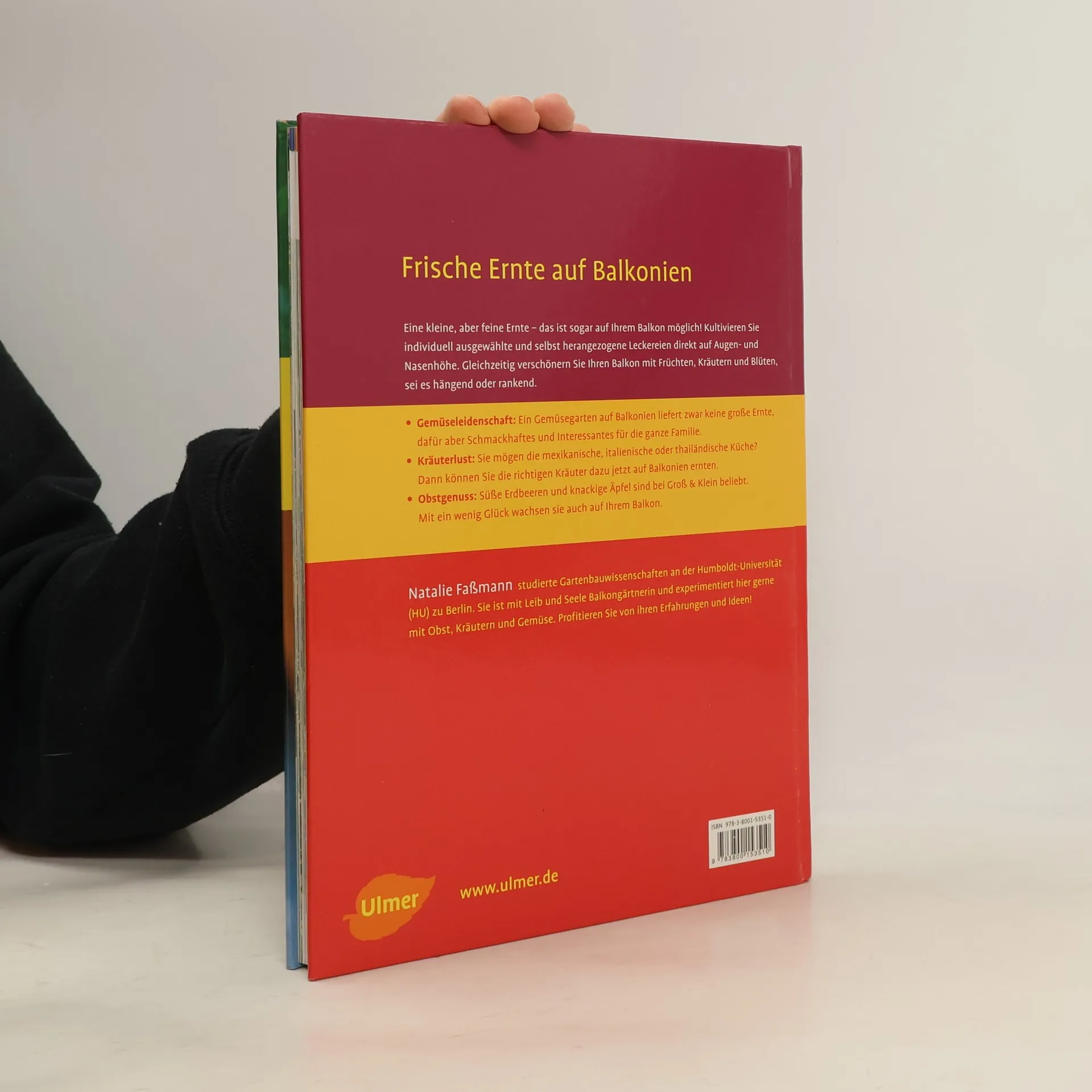 Frische Ernte auf Balkonien Eine kleine, aber feine Ernte das ist sogar auf Ihrem Balkon möglich! - Kultivieren Sie individuell ausgewählte und selbst herangezogene Leckereien direkt auf Augen- und Nasenhöhe. Gleichzeitig verschönern Sie Ihren Balkon mit Früchten, Kräutern und Blüten, sei es hängend oder rankend. - Gemüseleidenschaft: Ein Gemüsegarten auf Balkonien liefert zwar keine große Ernte, dafür aber Schmackhaftes und Interessantes für die ganze Familie. - Kräuterlust: Sie mögen die mexikanische, italienische oder thailändische Küche? Dann können Sie die richtigen Kräuter dazu jetzt auf Balkonien ernten. - Obstgenuss: Süße Erdbeeren und knackige Äpfel sind bei Groß & Klein beliebt. Mit ein wenig Glück wachsen sie auch auf Ihrem Balkon. Natalie Faßmann studierte Gartenbauwissenschaften an der Humboldt-Universität (HU) zu Berlin. Sie ist mit Leib und Seele Balkongärtnerin und experimentiert hier gerne mit Obst, Kräutern und Gemüse. Profitieren Sie von ihren Erfahrungen und Ideen!