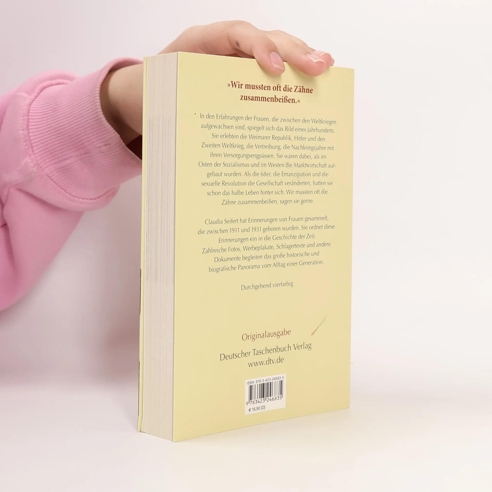 Ein Rückblick von Frauen, die zwischen den Kriegen geboren wurden In den Erfahrungen der Frauen, die zwischen den Weltkriegen geboren wurden, spiegelt sich das Bild eines Jahrhunderts. Sie erlebten die Weimarer Republik, Hitler und den Zweiten Weltkrieg, die Vertreibung, die Nachkriegsjahre mit ihren Versorgungsengpässen. Dann wurden im Osten der Sozialismus und im Westen die Marktwirtschaft aufgebaut. Als die 68er, die Emanzipation und die sexuelle Revolution die Gesellschaft veränderten, hatten diese Frauen schon das halbe Leben hinter sich und mussten sich fragen lassen, warum sie so und nicht anders gelebt haben. Da mussten wir eben die Zähne zusammenbeißen, sagen sie oft. Claudia Seifert ordnet die Erinnerungen ein in die Geschichte der Zeit und lässt sie durch Familienfotos, Schlagertexte und andere Zeugnisse anschaulich werden.