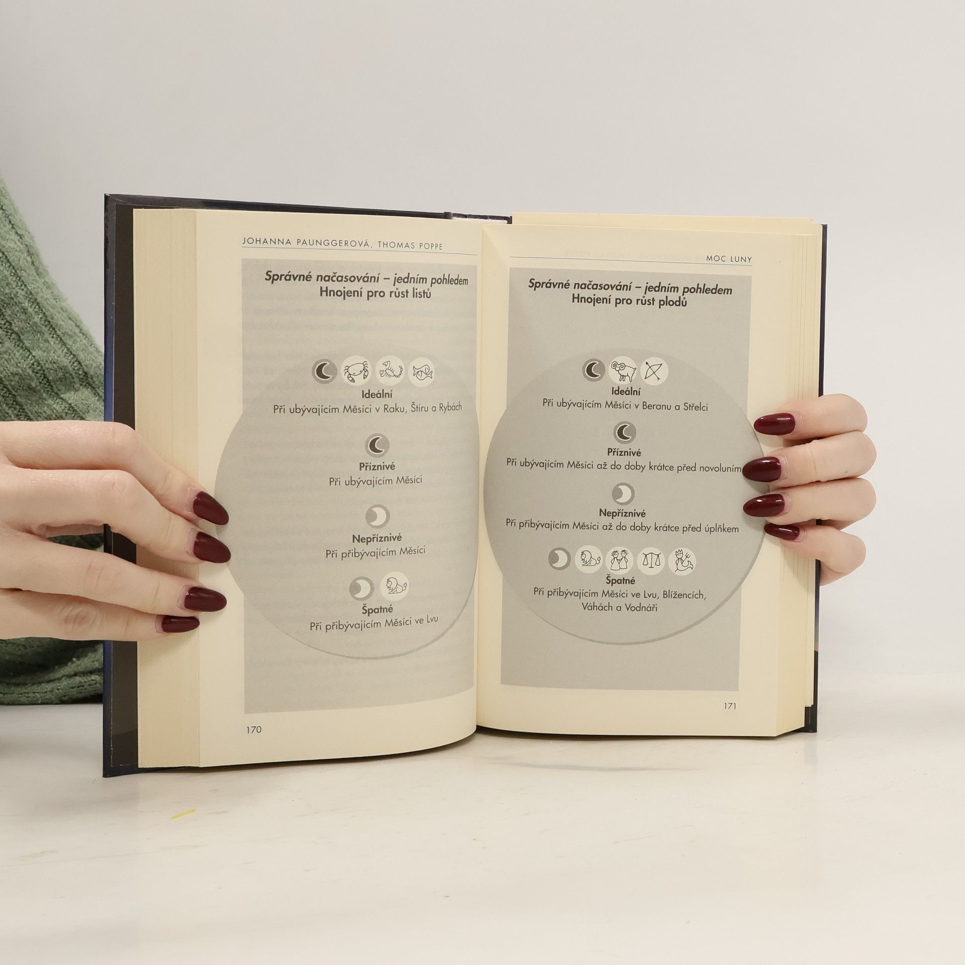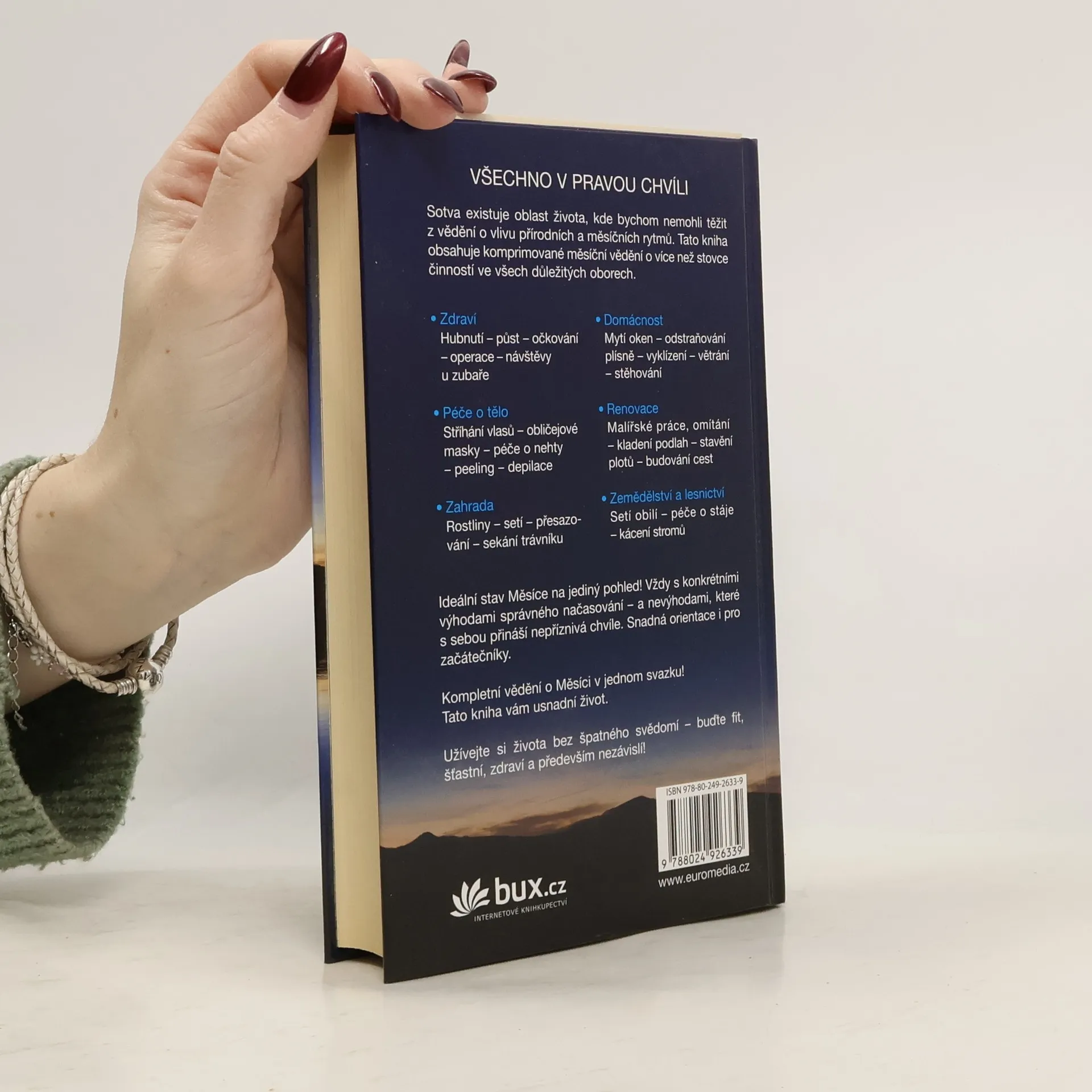 VŠECHNO V PRAVOU CHVÍLI. Tato kniha obsahuje komprimované měsíční vědění o více než stovce činností ve všech důležitých oborech.Ideální stav Měsíce na jediný pohled! Vždy s konkrétními výhodami správného načasování – a nevýhodami, které s sebou přináší nepříznivá chvíle. Snadná orientace i pro začátečníky.